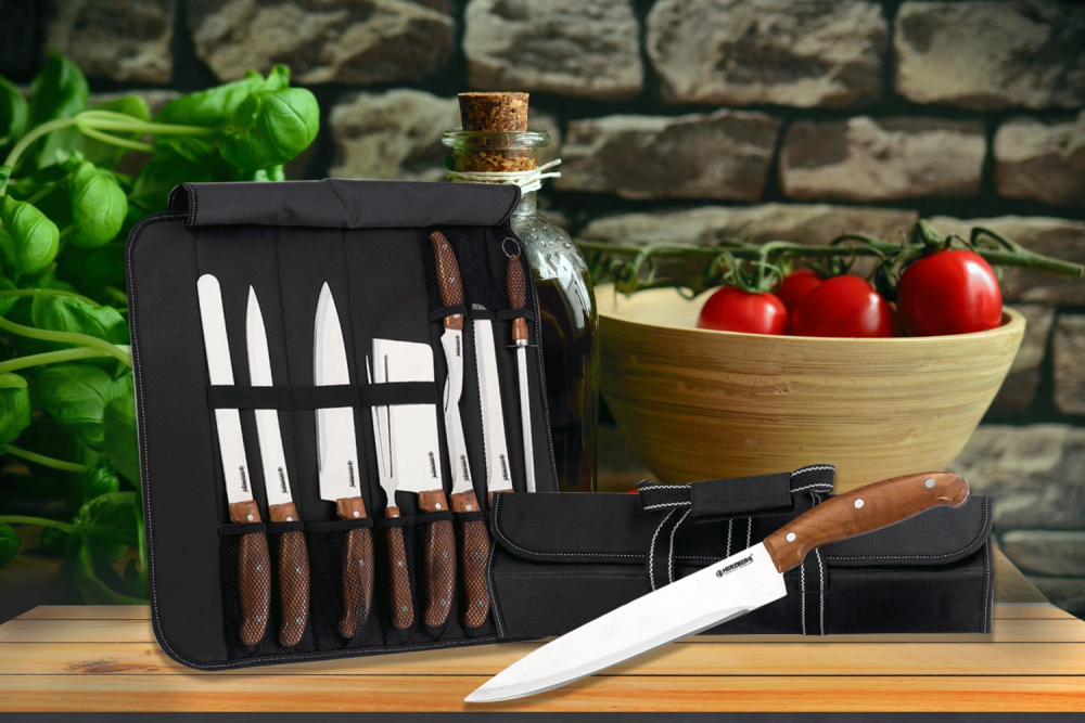 - Itens Inclusos: 7 facas, 1 afiador de facas, 1 garfo trancador, 1 bolsa dobrável para transporte