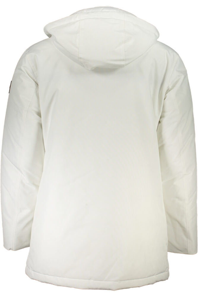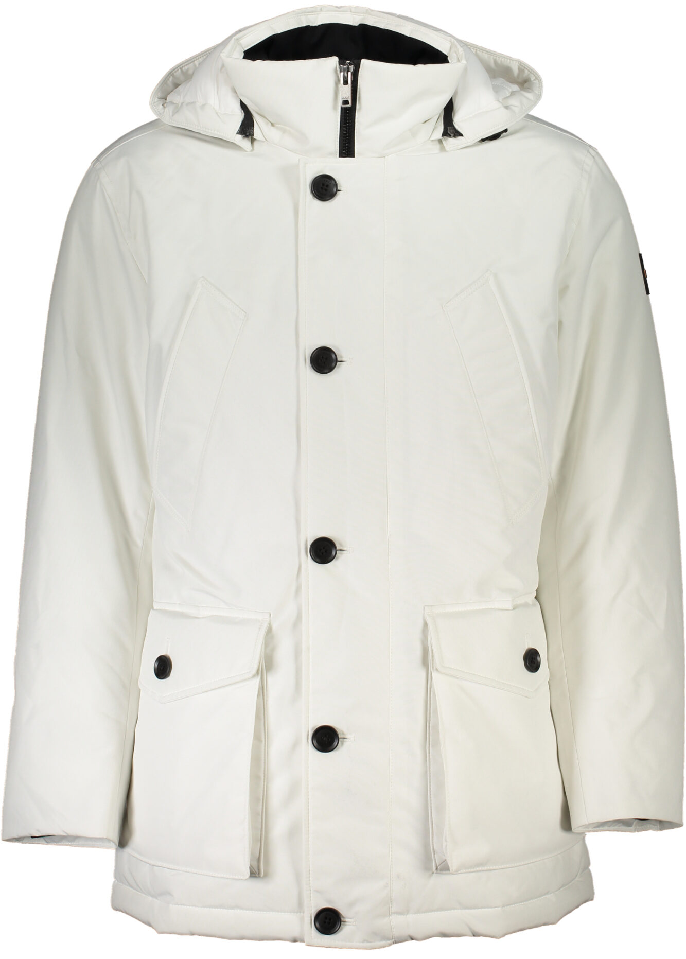Casaco mangas compridas com capuz removível, 2 bolsos, 2 bolsos grandes, 1 bolso interno, botões, zíper, logotipo