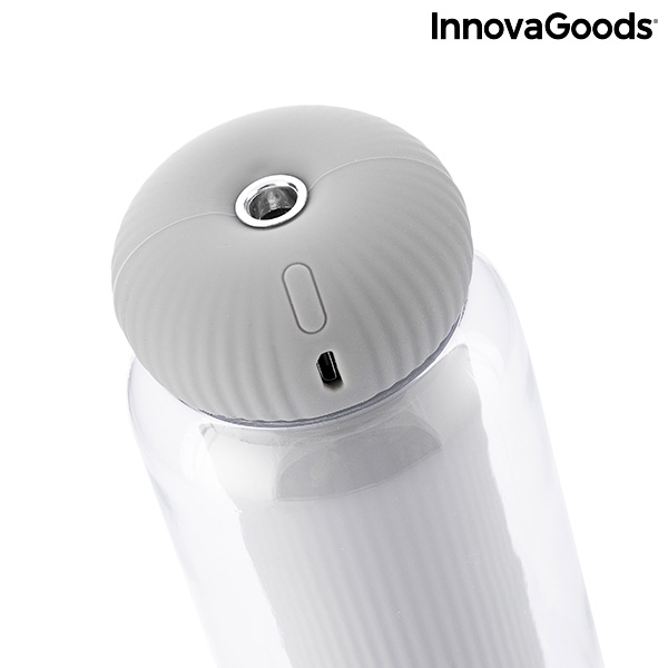 Um original humidificador ultrassónico multifunções, que gera uma neblina fria contínua ou intermitente. Pode igualmente ser utilizado como difusor de aromas, bastando adicionar algumas gotas de uma essência à sua escolha para criar uma atmosfera mais agradável. Com uma luz LED quente que acende e apaga lenta e progressivamente, produzindo uma atmosfera relaxante. A função humidificante e a função de iluminação podem funcionar simultânea ou independentemente. Graças ao seu design silencioso e compacto, é discreto e tem uma capacidade de 300 ml, para além de ocupar um mmínimo de espaço, pelo que pode ser colocado discretamente em qualquer local. Além disso, pode ser adaptado a outros recipientes que não os seus próprios (copos, garrafas…). O aparelho desliga-se automaticamente após 4 horas de funcionamento. Com silicone de toque suave, base antiderrapante e um spray ultrassónico de 60-70 ml/h. Inclui 5 cilindros de algodão (4 de reserva) e cabo de ligação USB para micro USB.