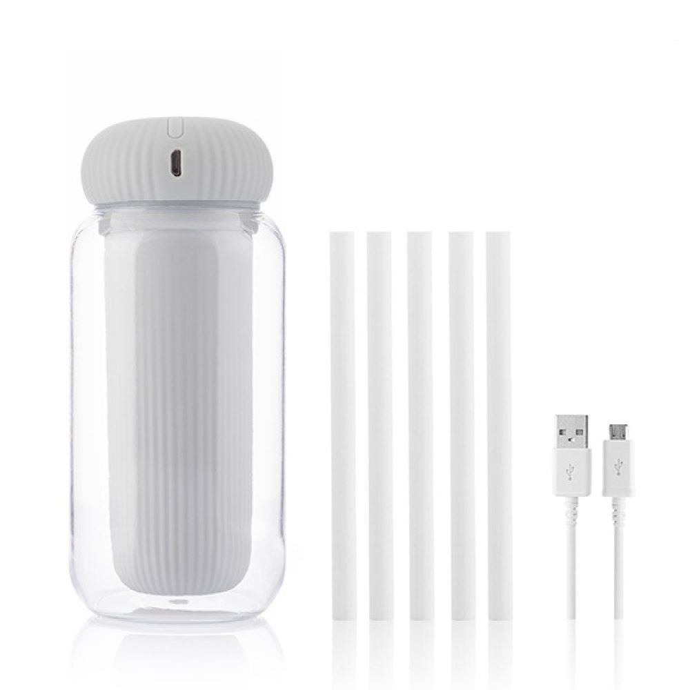 Um original humidificador ultrassónico multifunções, que gera uma neblina fria contínua ou intermitente. Pode igualmente ser utilizado como difusor de aromas, bastando adicionar algumas gotas de uma essência à sua escolha para criar uma atmosfera mais agradável. Com uma luz LED quente que acende e apaga lenta e progressivamente, produzindo uma atmosfera relaxante. A função humidificante e a função de iluminação podem funcionar simultânea ou independentemente. Graças ao seu design silencioso e compacto, é discreto e tem uma capacidade de 300 ml, para além de ocupar um mmínimo de espaço, pelo que pode ser colocado discretamente em qualquer local. Além disso, pode ser adaptado a outros recipientes que não os seus próprios (copos, garrafas…). O aparelho desliga-se automaticamente após 4 horas de funcionamento. Com silicone de toque suave, base antiderrapante e um spray ultrassónico de 60-70 ml/h. Inclui 5 cilindros de algodão (4 de reserva) e cabo de ligação USB para micro USB.