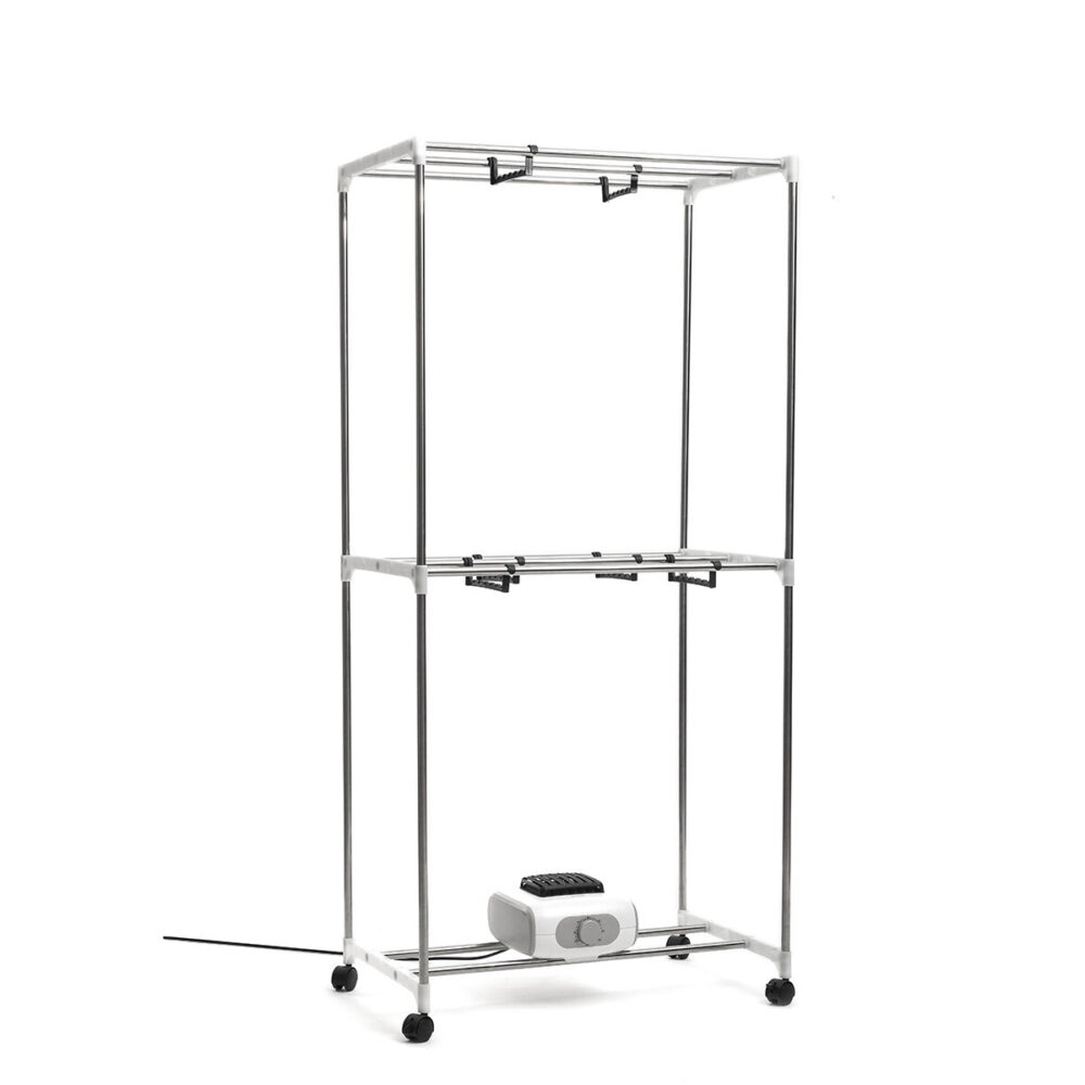 Um secador elétrico portátil de 2 alturas (1200 W) ideal para estender e secar a roupa com eficácia e rapidez. Além disso, esteriliza e elimina olores. Dispõe de 6 suportes para cabides, temporizador, rodas e capa com fecho-de-correr removível e lavável.