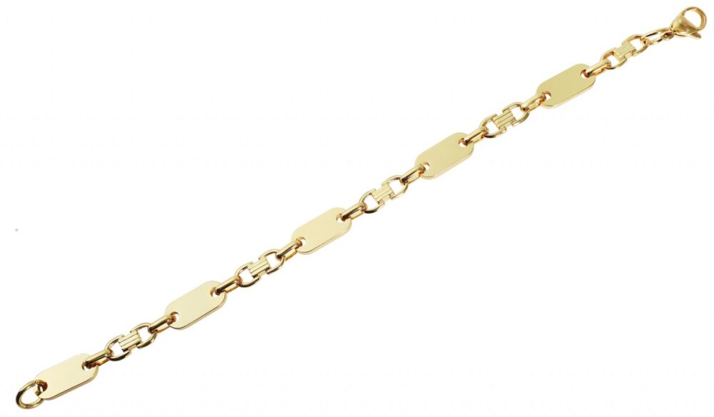 Ino – muito espaço para uma gravação personalizada, aqui não há limites. Esta pulseira em aço inoxidável está disponível em dois comprimentos: 19 cm e 21 cm. As placas de gravação e os elementos texturados conferem à pulseira um aspeto impressionante. Uma gravação personalizada – as placas individuais de 18 x 8 mm oferecem espaço suficiente para o efeito. O fecho lagosta garante uma fixação segura e facilita a colocação e a retirada. Combine esta pulseira com o colar “Benja” a condizer
