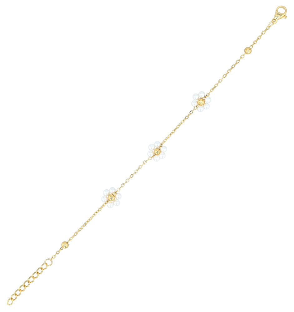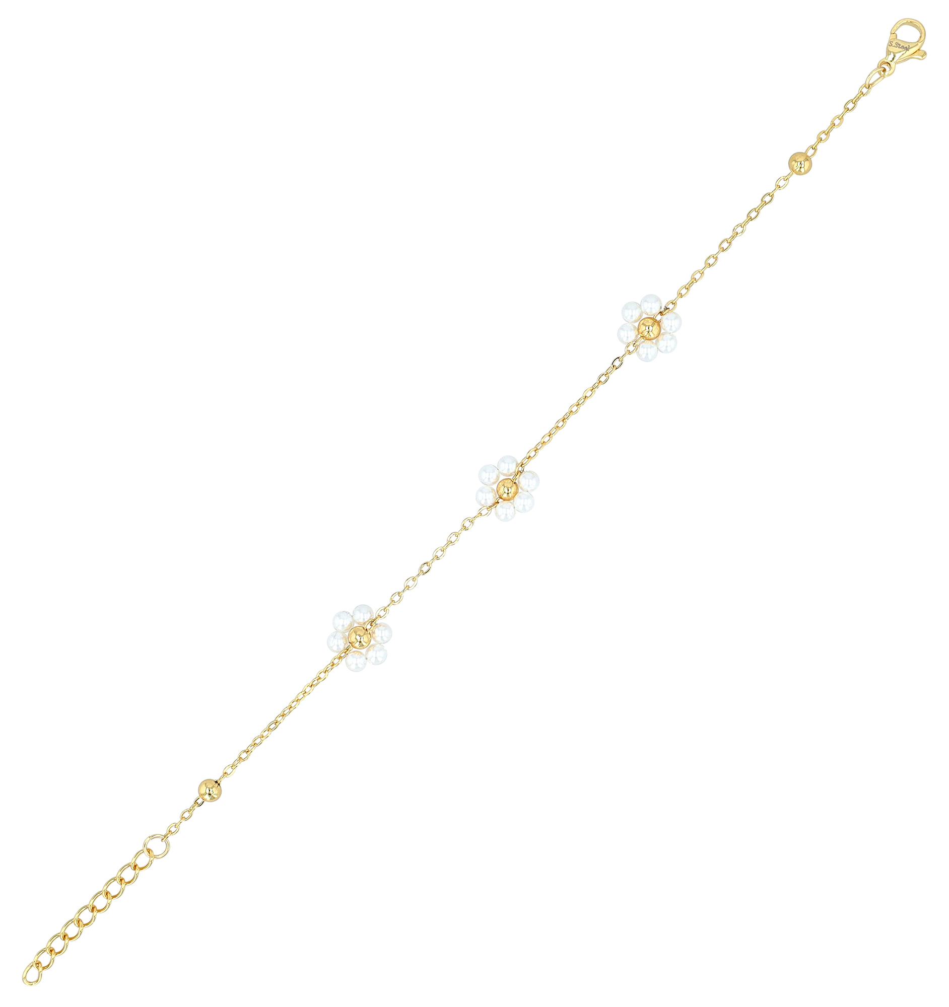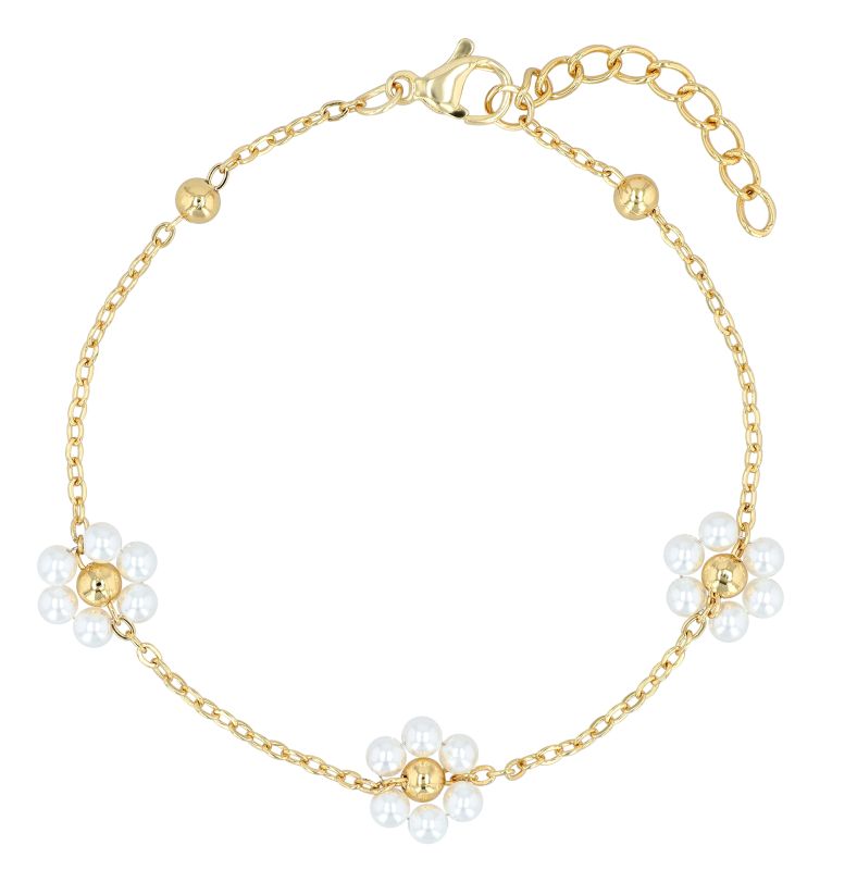 O diferencial da pulseira são as três pequenas flores artísticas (10 mm de diâmetro) distribuídas uniformemente ao longo de seu comprimento. Cada flor é composta por delicadas contas de vidro e uma esfera de aço inoxidável. Esses elementos intrincados criam um brilho sutil e encantador no seu pulso.