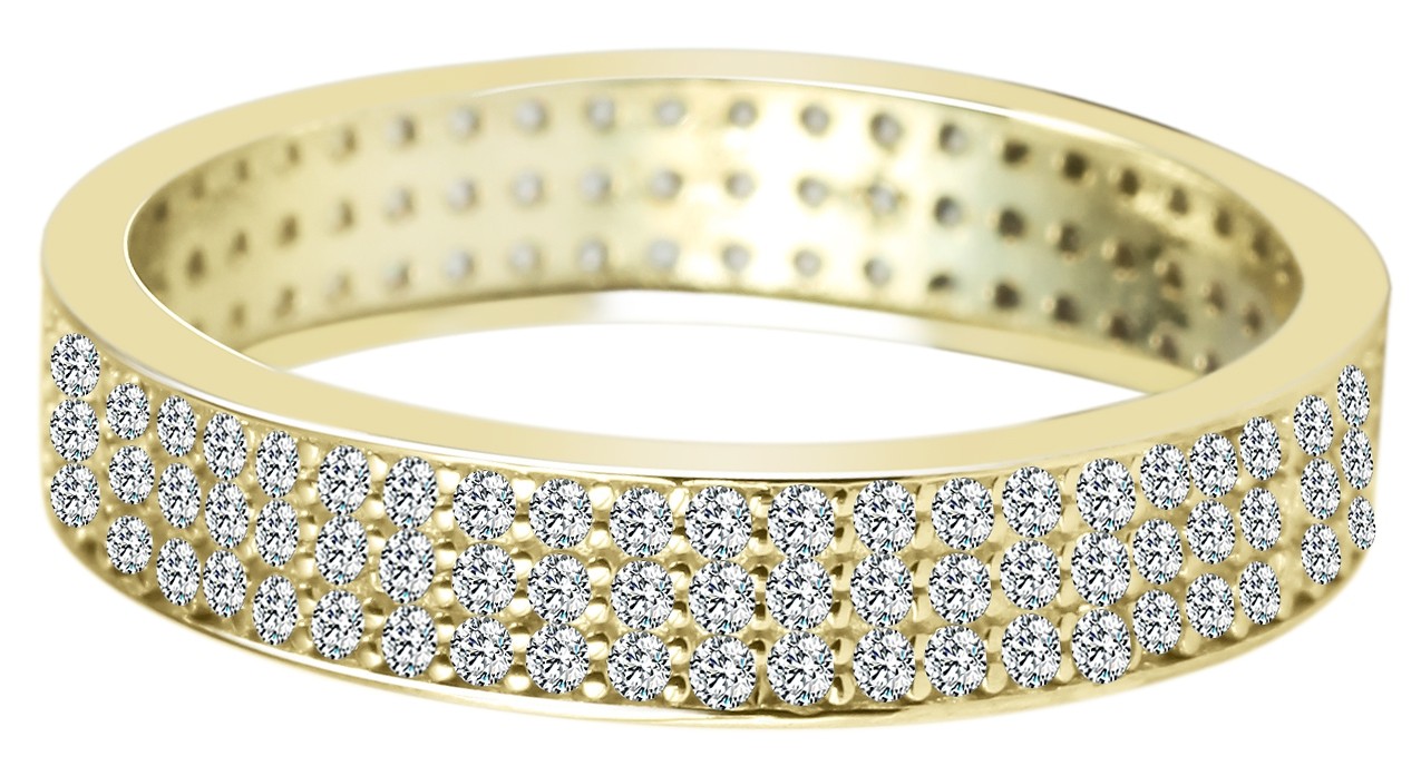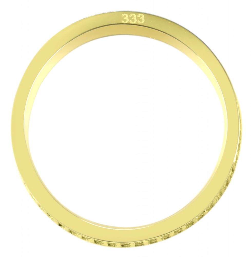 Este anel feminino é fabricado em ouro amarelo 333/- de alta qualidade e tem um design discreto e discreto com um acabamento de superfície polido. A banda do anel é decorada com três filas de pedras zircónias brilhantes. O acabamento branco cria um contraste elegante e atrativo. O anel está disponível nos tamanhos 50 – 60, tem uma largura de 4 mm e uma espessura de 1,5 mm. Graças ao seu design elegante e intemporal, esta elegante peça de joalharia brilha com qualquer roupa. Também é ideal para oferecer como presente, pois o material de alta qualidade e o acabamento elaborado fazem deste anel um companheiro eterno.
