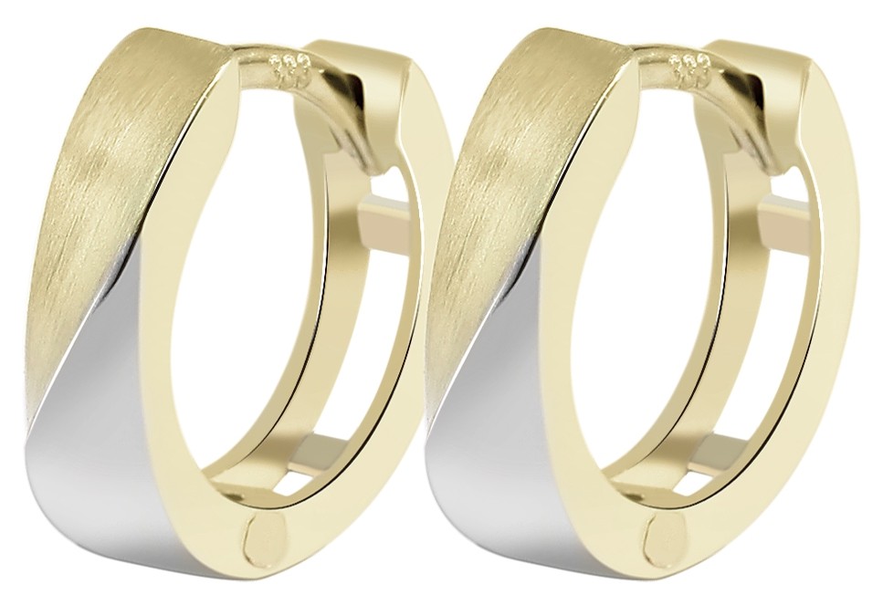 Os brincos de argola com dobradiças estão disponíveis em ouro 333 ou 375 e em ouro amarelo e ouro branco. O contraste do design bicolor e os diferentes acabamentos de superfície mate e polido tornam estas jóias de orelha muito especiais. Os brincos são também revestidos a ródio. Isto significa que são revestidos com uma camada de metal precioso de alta qualidade que realça ainda mais o tom branco. As argolas podem ser abertas e fechadas através de um mecanismo articulado. Este mecanismo é fácil de acionar e evita que os brincos caiam. Estes brincos especiais chamam muito a atenção e garantem que não passarão despercebidos. As dimensões resultam de um diâmetro de 9 mm, uma largura de 3 mm e uma espessura de material de 2 mm.