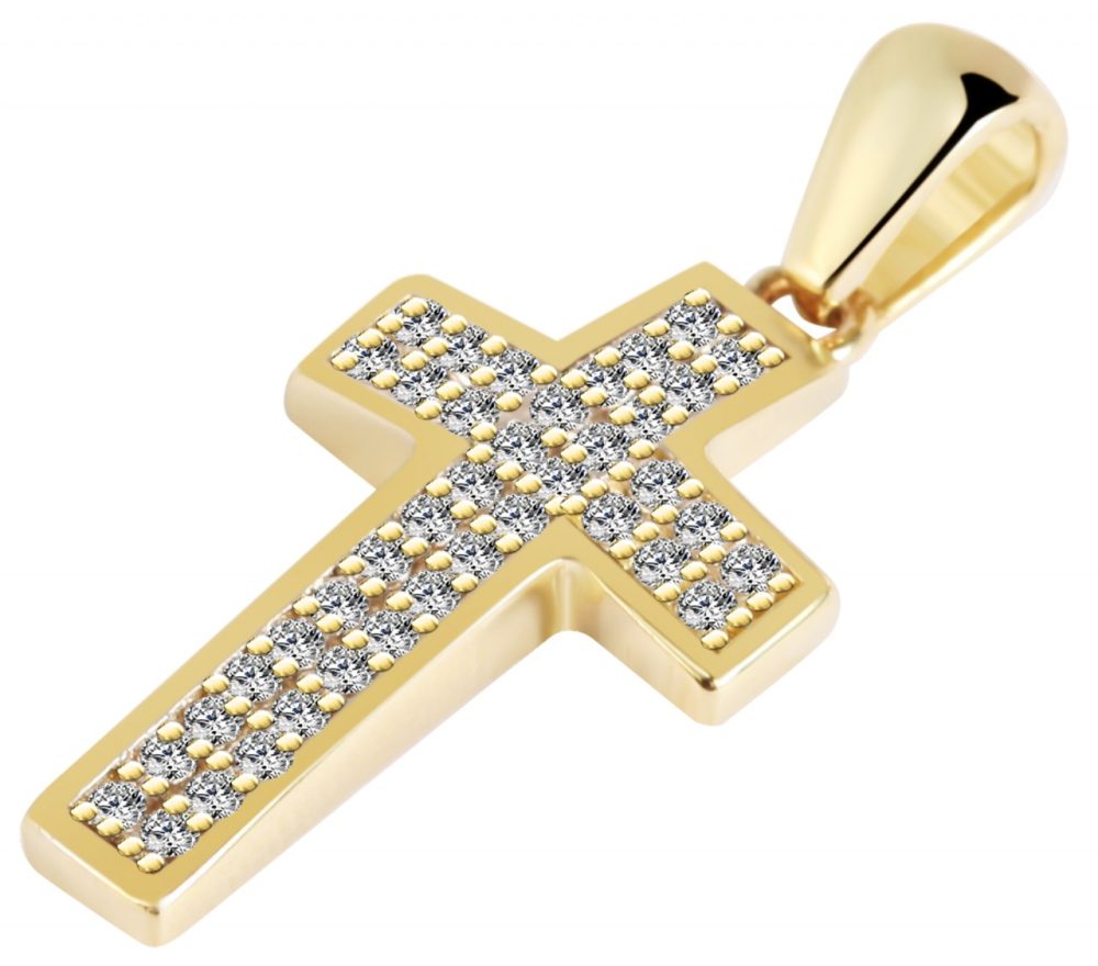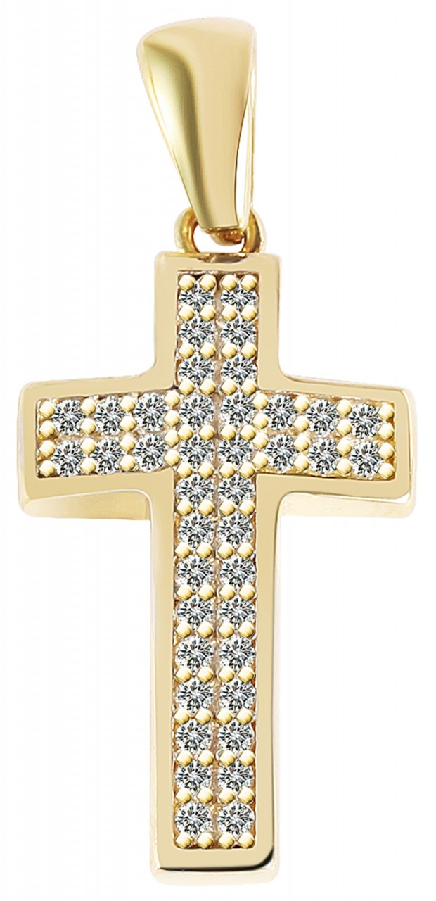 Feito em ouro amarelo 375 de alta qualidade, este pingente de cruz exala sofisticação maravilhosa. O ouro confere-lhe uma aparência quente e luxuosa que envolve quem o usa com um toque de elegância. É um material conhecido pela sua durabilidade e valor duradouro e que proporcionará alegria para sempre. As brilhantes pedras de zircônia que cobrem toda a cruz conferem ao pingente um brilho incomparável. Cada pedra foi artisticamente colocada para criar o máximo brilho e brilho. Com seu tamanho de 18 x 11 mm, destaca-se com habilidade, mas não de forma intrusiva. Experimente o brilho radiante deste pingente de cruz e deixe-se encantar pela sua beleza.