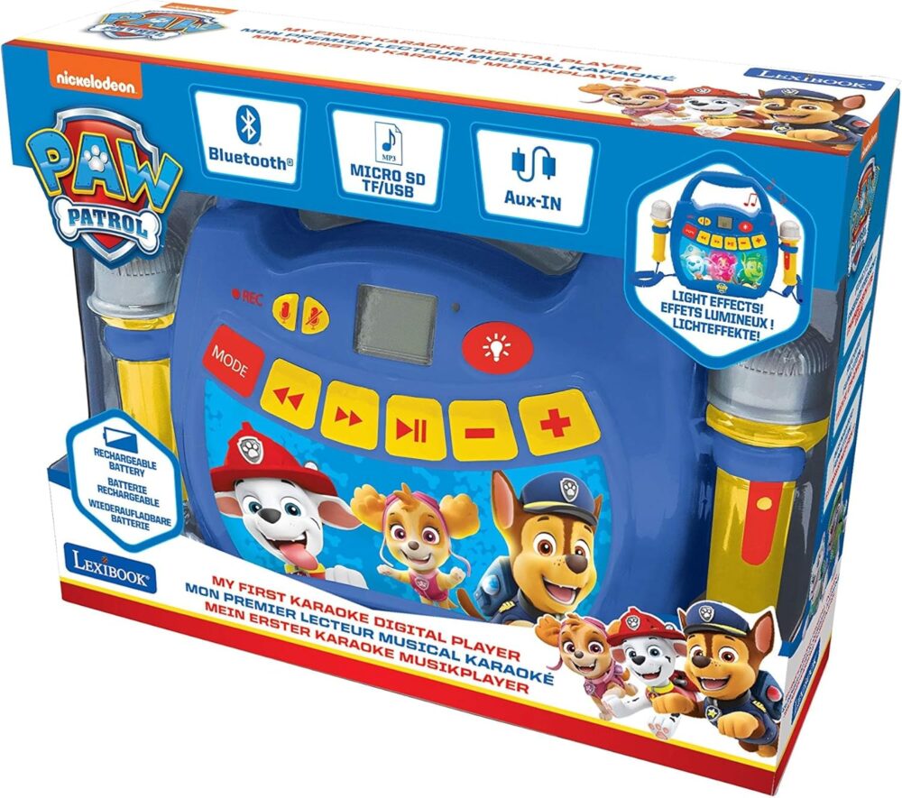 • O reprodutor de karaokê portátil para crianças Paw Patrol, funciona sem fios com todos os dispositivos habilitados para Bluetooth!