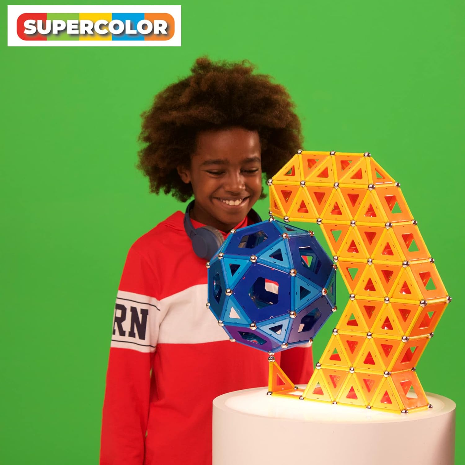 - A caixa contém: 12 esferas de aço; 12 barras magnéticas de cor verde claro, laranja, vermelho e azul claro; 2 painéis de base triangular de cor amarelo e verde claro; 2 painéis de base quadrada vermelhos; 1 painel de base pentagonal laranja