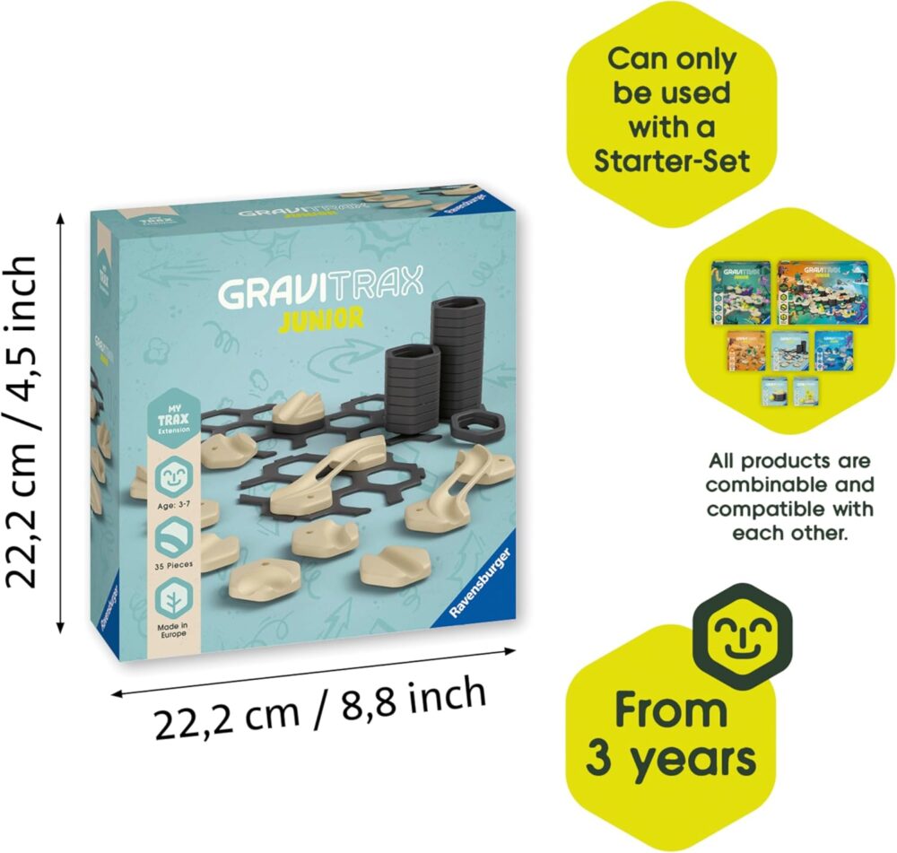 - Modulável fino e compatível com todos os produtos GraviTrax JUNIOR. Com este jogo de expansão Trax, as crianças pequenas podem começar a brincar e construir circuitos imediatamente. Descubra uma ampla gama JUNIOR de conjuntos e elementos, todos combináveis entre eles, para impulsionar os circuitos.