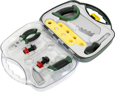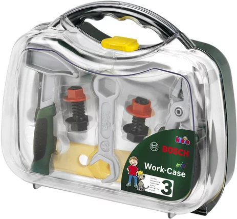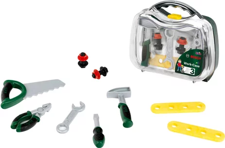 - Esta mala BOSCH transparente contém os seguintes acessórios para bricolage: – serra – alicate – martelo – chave inglesa ajustável – parafusos – porcas – ripas – chave de fenda