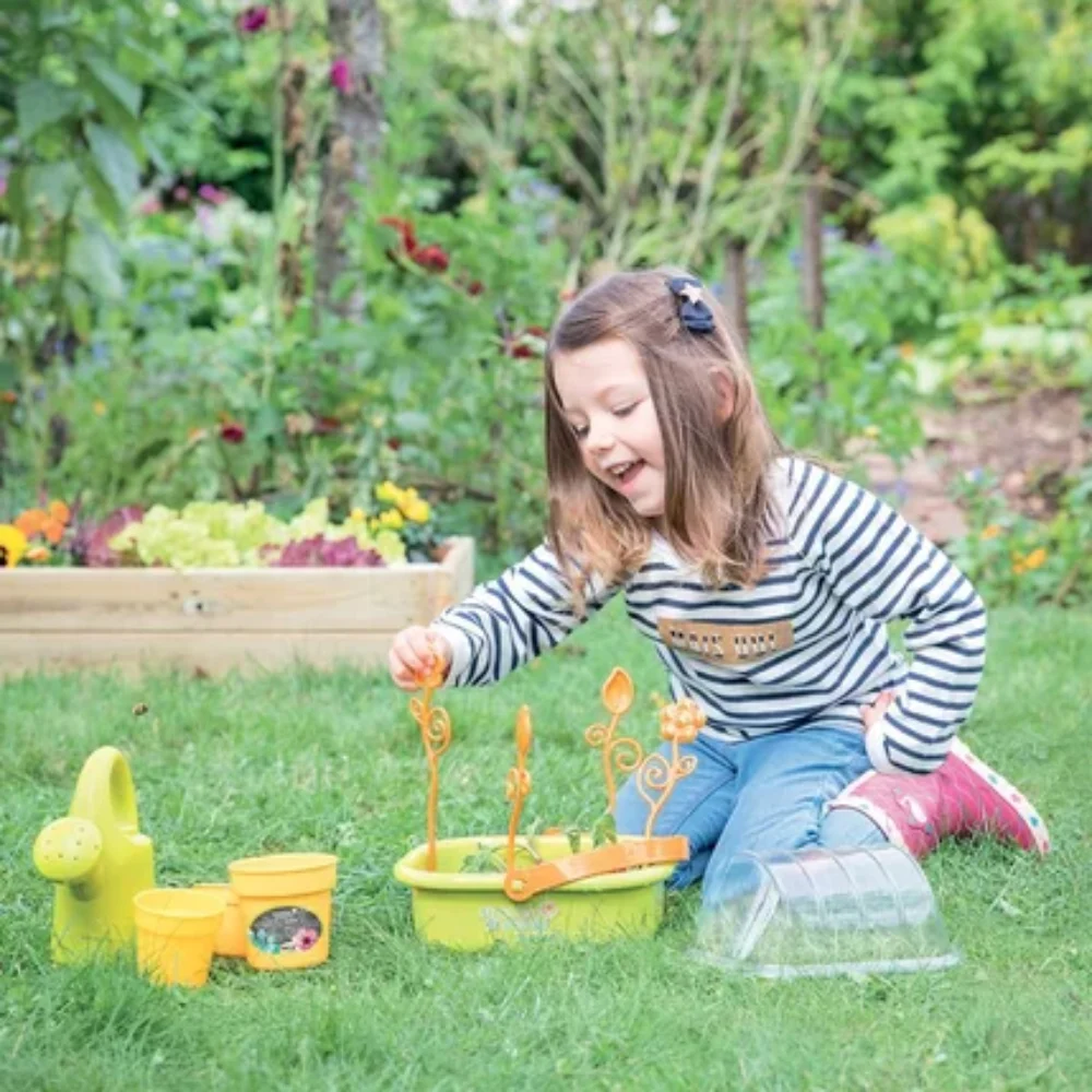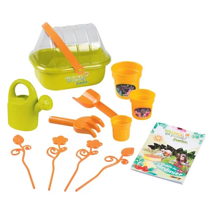 - Inclui: 1 regador, 4 estacas, 1 par (pá e ancinho), 3 vasos de tamanhos diferentes (pequeno, médio, grande) e 1 livreto explicativo.