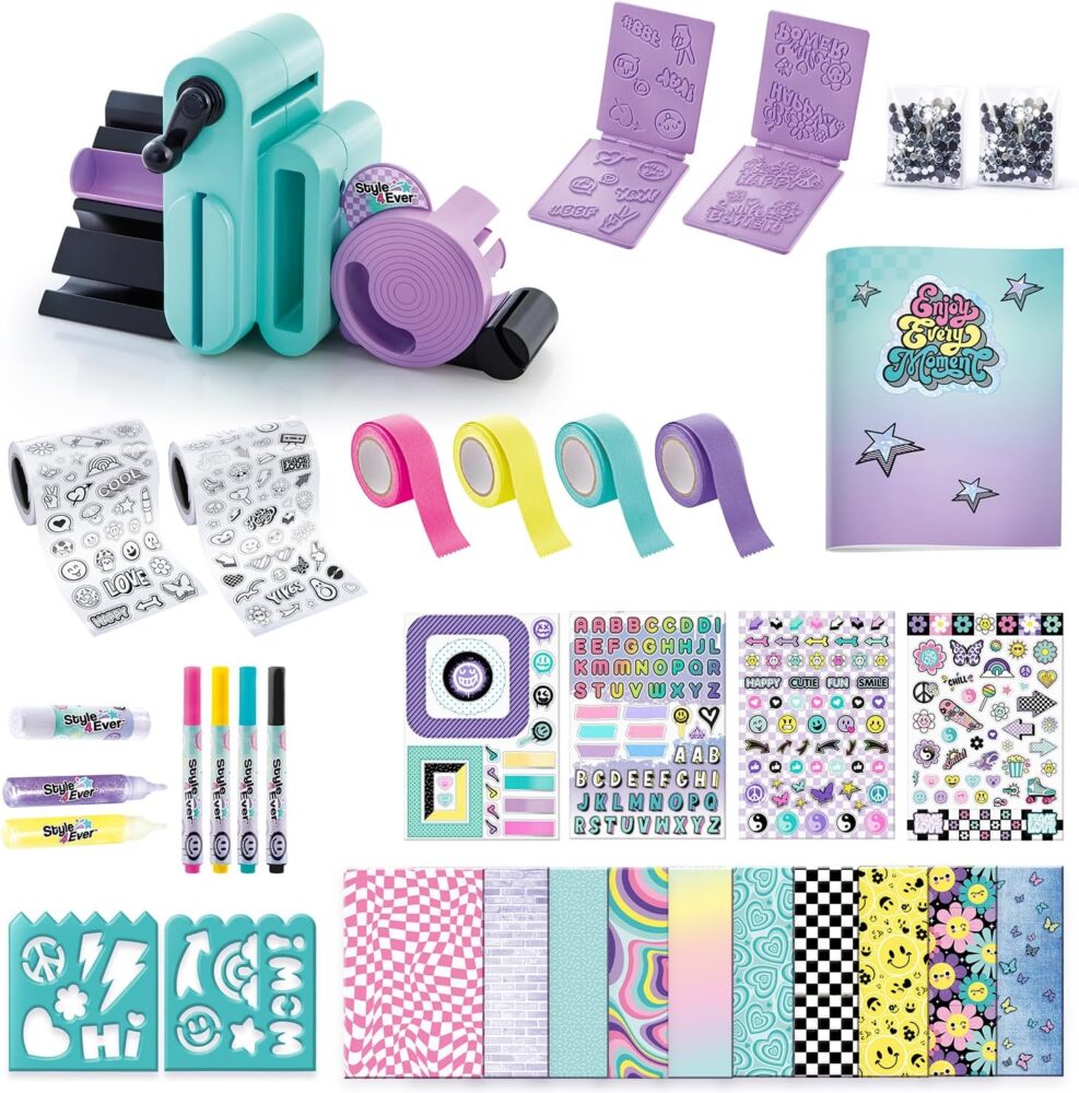 - MUSJFS Acessórios incluídos: Neste produto, encontrará um caderno para personalizar, placas de estampagem, folhas de papel estampado, rolos de fita adesiva, autocolantes para personalizar, canetas de marca, palmilhas, folhas de autocolantes, pedras preciosas e barra de cola.