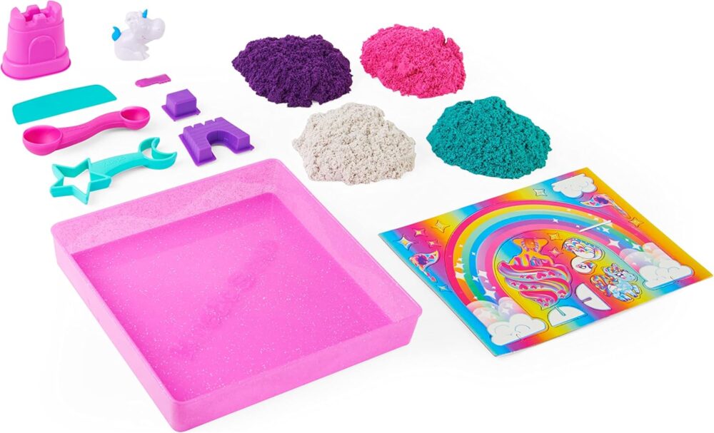 - 907 g de areia: crie o mundo dos unicórnios com 907 g de areia brilhante de 3 cores e 8 moldes de ferramentas; use os selos para moldar, os moldes para construir e o unicórnio para dar vida às suas criações e muito mais