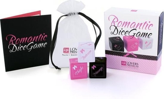Enrole os três dados (rosa para a parte do corpo, preto para a ação e branco para o local) e desfrute de uma noite romântica maravilhosa juntos.