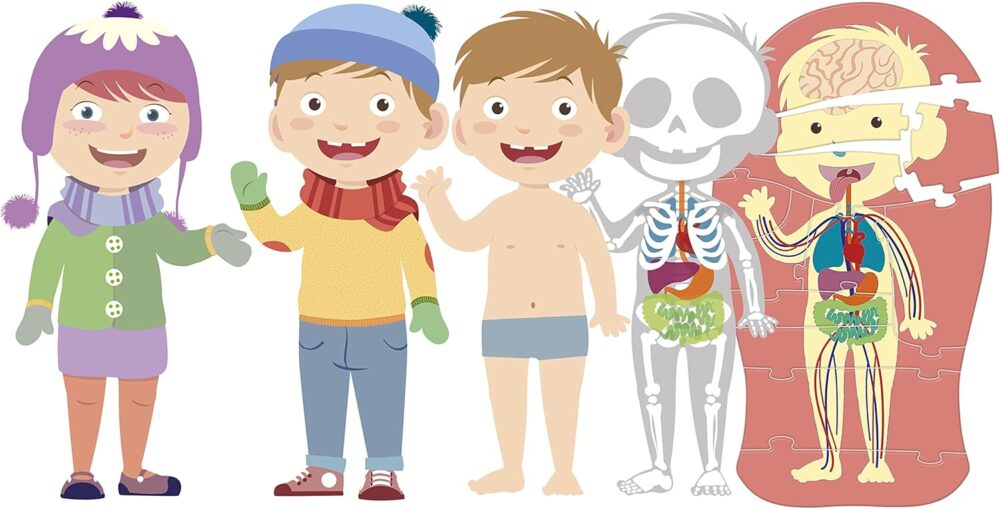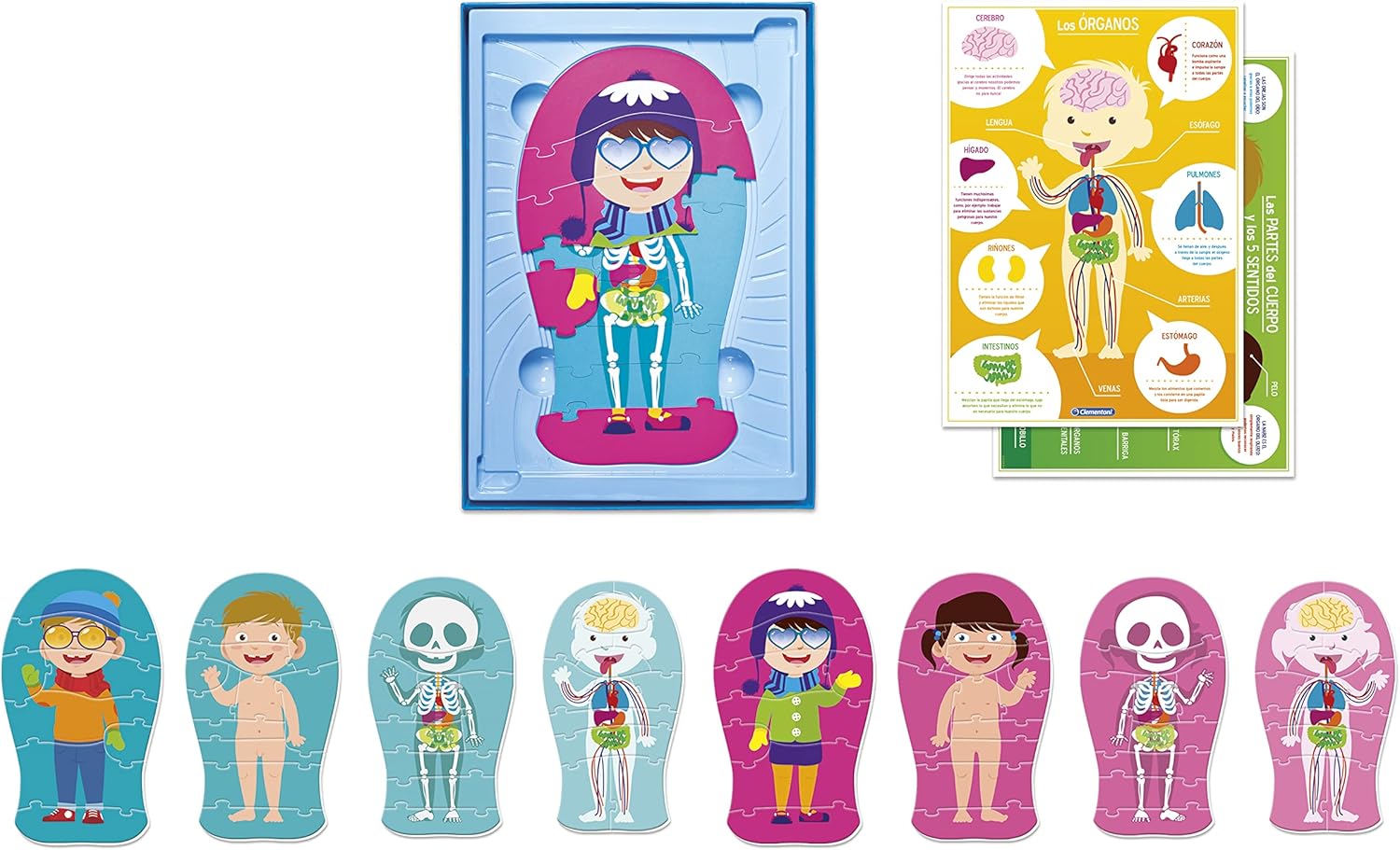- O conjunto inclui uma série de quebra-cabeças empilháveis que permitem descobrir gradualmente o corpo humano: do esqueleto aos órgãos, e da pele à roupa
