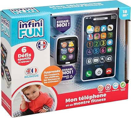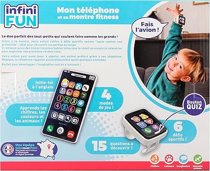- Multiusos: o telefone oferece 4 modos de jogo para aprender números, cores, nomes de animais, suas características e gritos. O telefone lembra-se automaticamente após alguns segundos para ainda mais diversão! O relógio de fitness incentiva o seu filho a se mover com os seus 6 desafios desportivos (dançar, saltar, girar...) e ensinará cores, números e formas também!