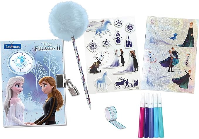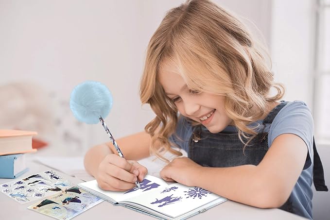 - Com ótimos acessórios para incentivar a criatividade e decorar seu diário: 1 caneta pompom, 5 canetas coloridas de feltro, 1 rolo de cola com padrões, 2 folhas de adesivo. A partir de 3 anos.