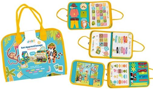 • Conteúdo: 1 saco, 2 lâminas para descobrir os gestos quotidianos (amarrar atacadores, fazer laços), 4 folhas para aprender o alfabeto, os números, as cores e as formas, 1 folha de quadro branco com 4 marcadores apagáveis a seco, 1 folha de quebra-cabeças da selva. Este modelo é feito de tecido para fornecer toda a resistência necessária para durar muito tempo. Mede 28 cm x 33 cm. As lâminas são separadas com um fecho de correr para que possa levá-las consigo para todas as suas atividades.
