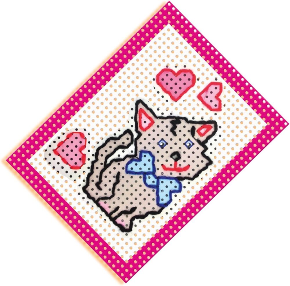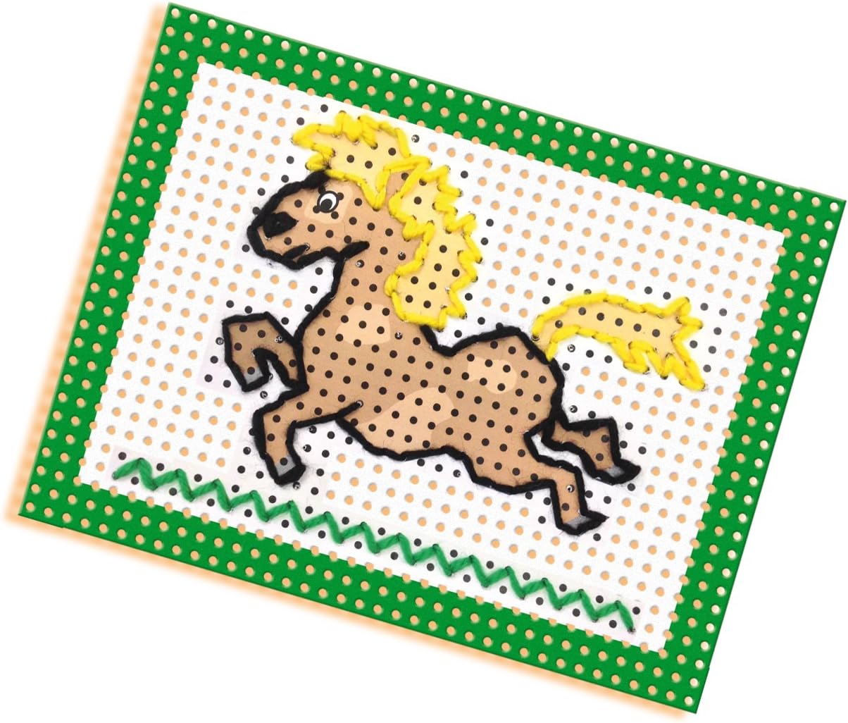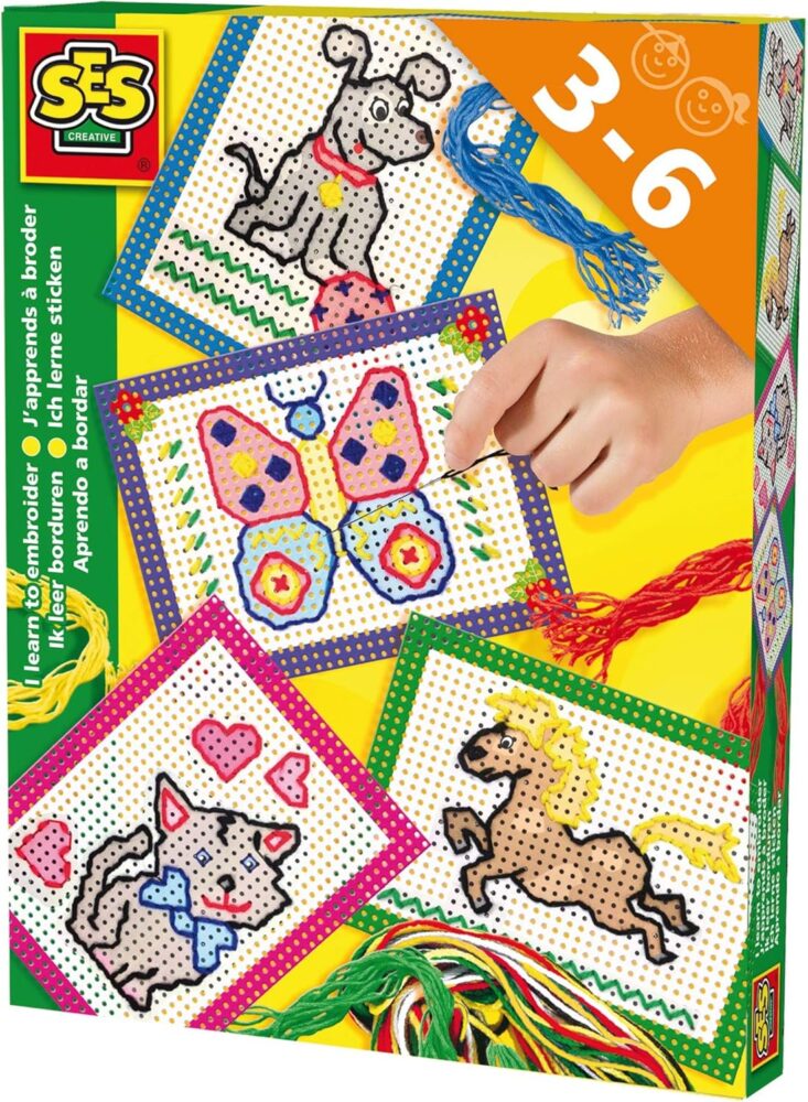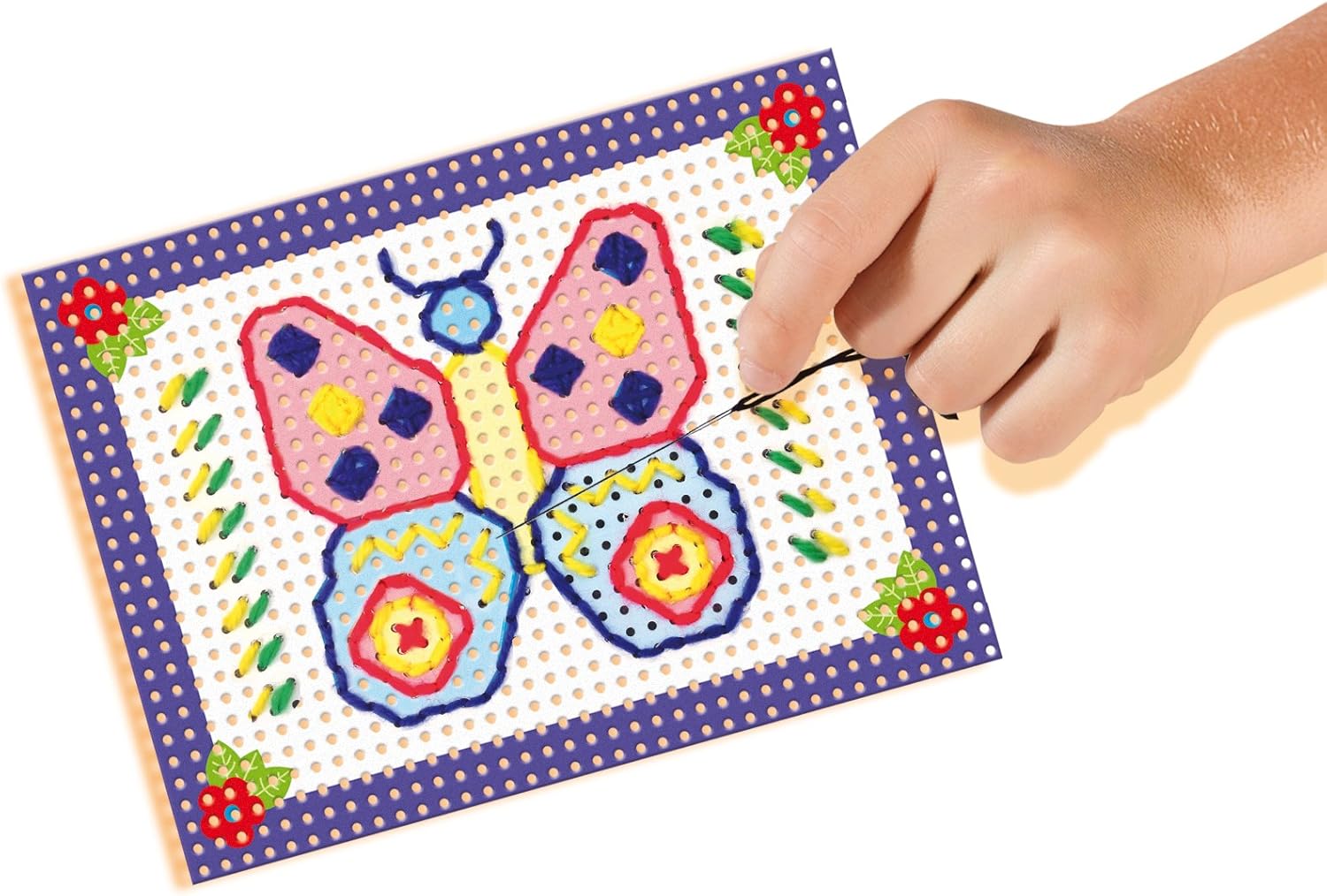 - 4 cartões para bordar pré-impressos, agulha, dedal e fio de 5 cores