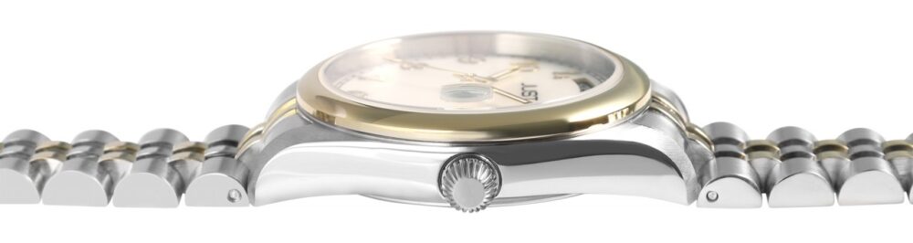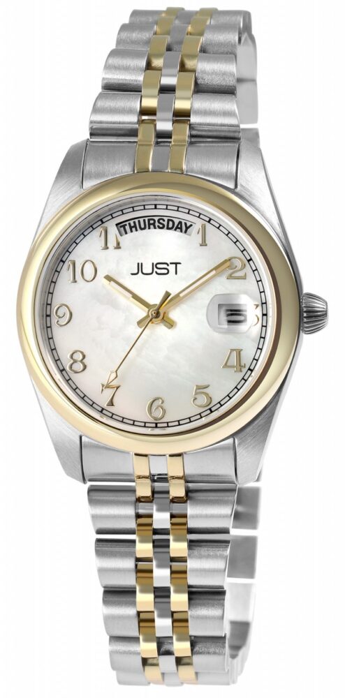 O relógio de senhora “Felicitas” da marca Just – o design moderno alia-se à elegância intemporal. A bracelete de elos em aço inoxidável de alta qualidade é confortável de usar. O prático fecho de borboleta facilita a abertura e o fecho, enquanto a bracelete pode ser personalizada removendo elos individuais. Com 34 mm de diâmetro e 9 mm de altura, a caixa em aço inoxidável tem um tamanho harmonioso que fica bem em qualquer pulso. O mostrador em madrepérola cintilante é um verdadeiro chamariz e é complementado por um simples índice de linhas ou, como nas versões 004 e 005, por um mostrador árabe. A hora continua a ser fácil de ler em condições de fraca luminosidade graças aos marcadores de horas e ponteiros luminescentes.