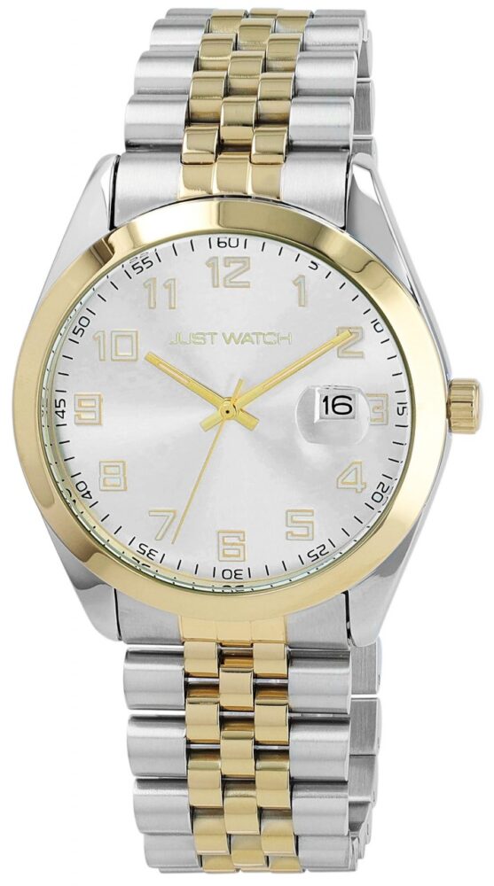 Cantos e bordas arredondados dominam a aparência deste relógio Just Watch com visor de data. A caixa, com diâmetro de 42 mm e altura de 11 mm, impressiona com um design redondo e harmonioso e tem um fundo de caixa de aço inoxidável gravável. Além do mostrador de data às 3 horas, este elegante relógio masculino apresenta índices e ponteiros luminosos que permitem que você saiba as horas com segurança, mesmo em horas tardias. A pulseira de elos, de 22 mm de largura, com detalhes foscos em ambos os lados e uma faixa central polida, impressiona pelo seu acabamento limpo e de alta qualidade e é fechada com um fecho dobrável de aço inoxidável de deslizamento suave que mantém o relógio firmemente no pulso. Os elos individuais podem ser removidos para ajuste individual ao seu pulso, a fim de encurtar o comprimento total do relógio de 22,4 cm.