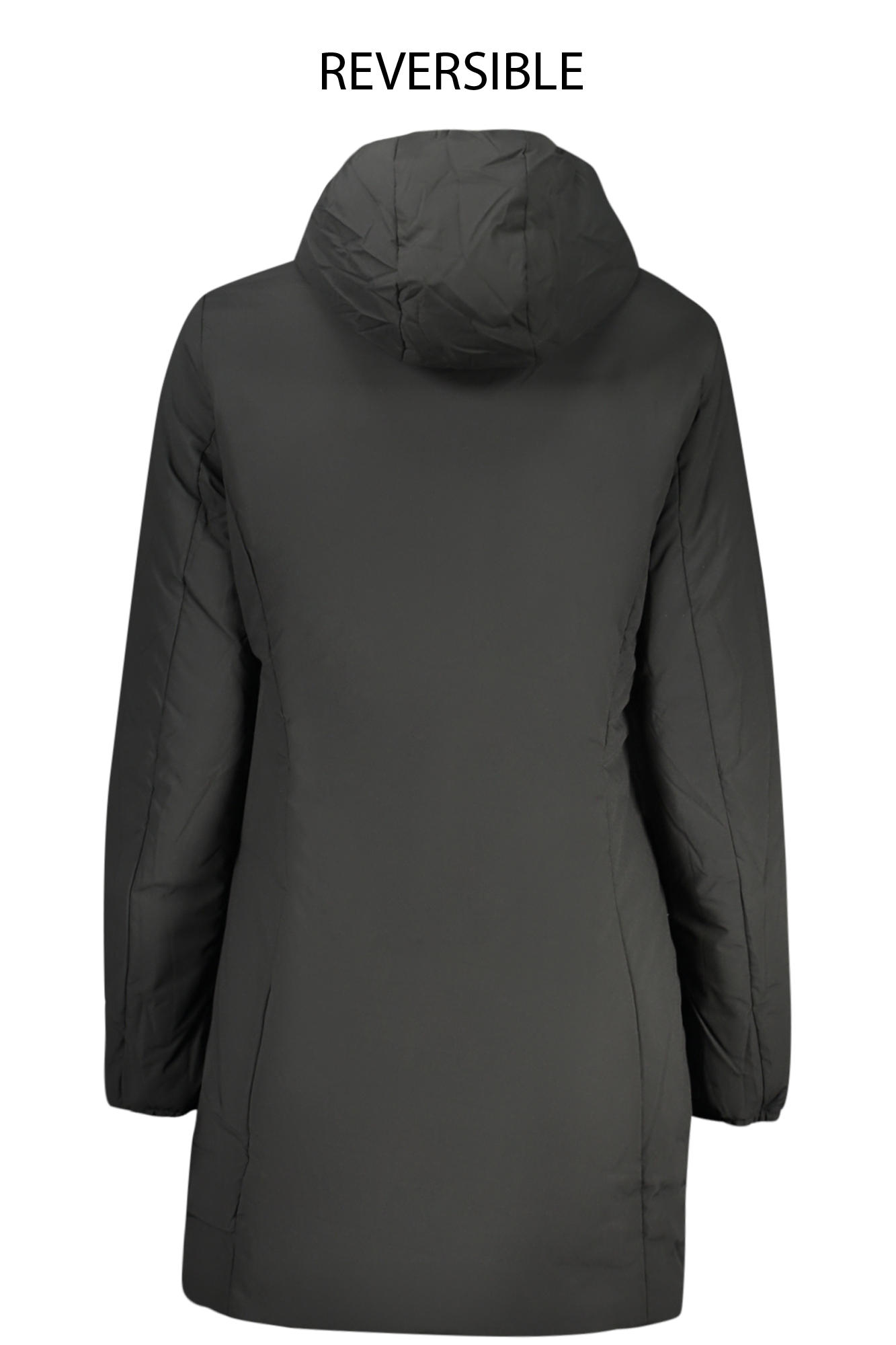 Casaco de manga comprida e capuz fixo, com design reversível nas cores preta e bege, oferecendo duas opções de estilo em uma só peça.