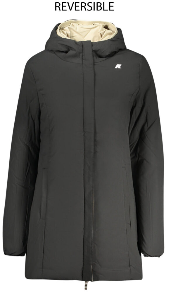 Casaco de manga comprida e capuz fixo, com design reversível nas cores preta e bege, oferecendo duas opções de estilo em uma só peça.