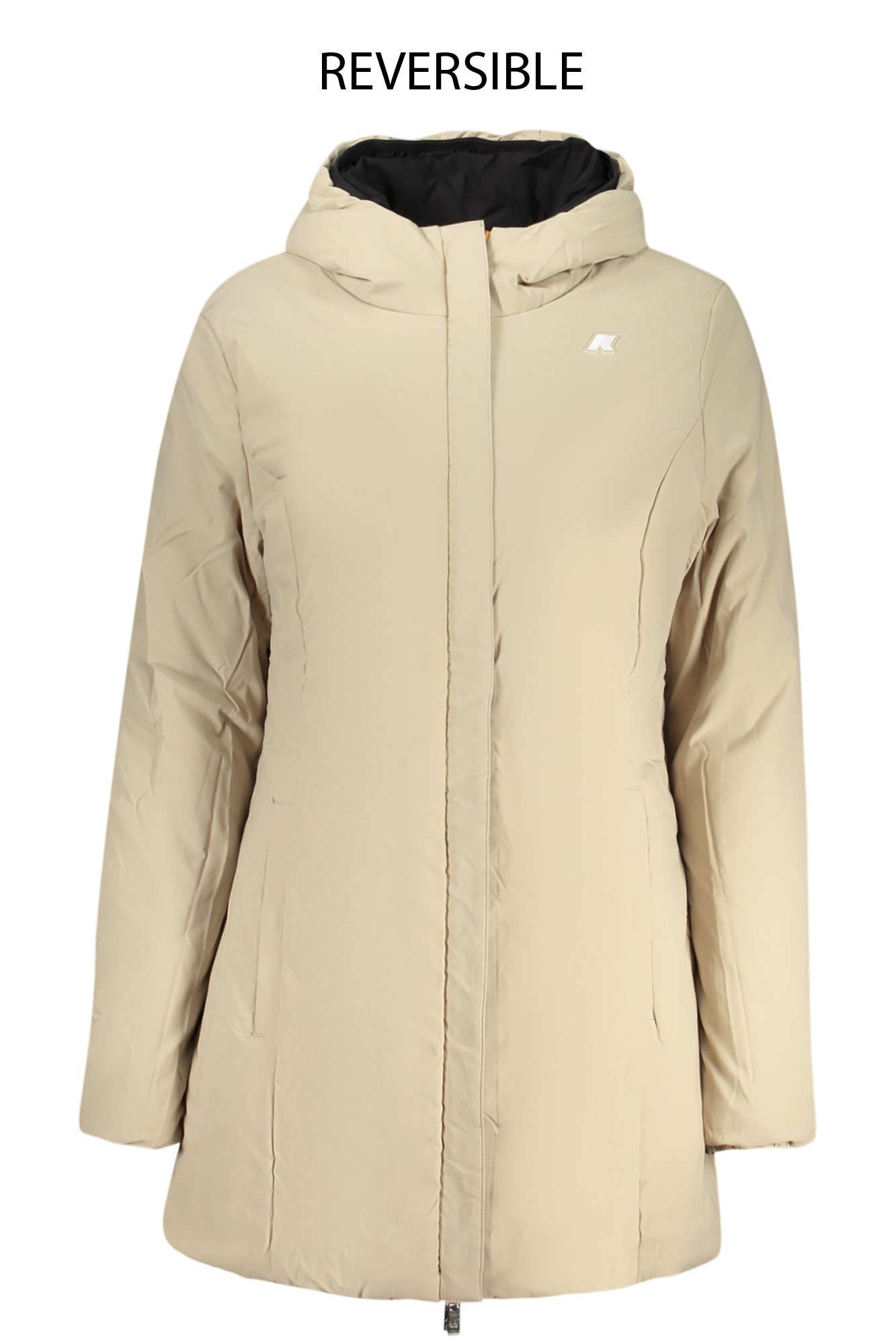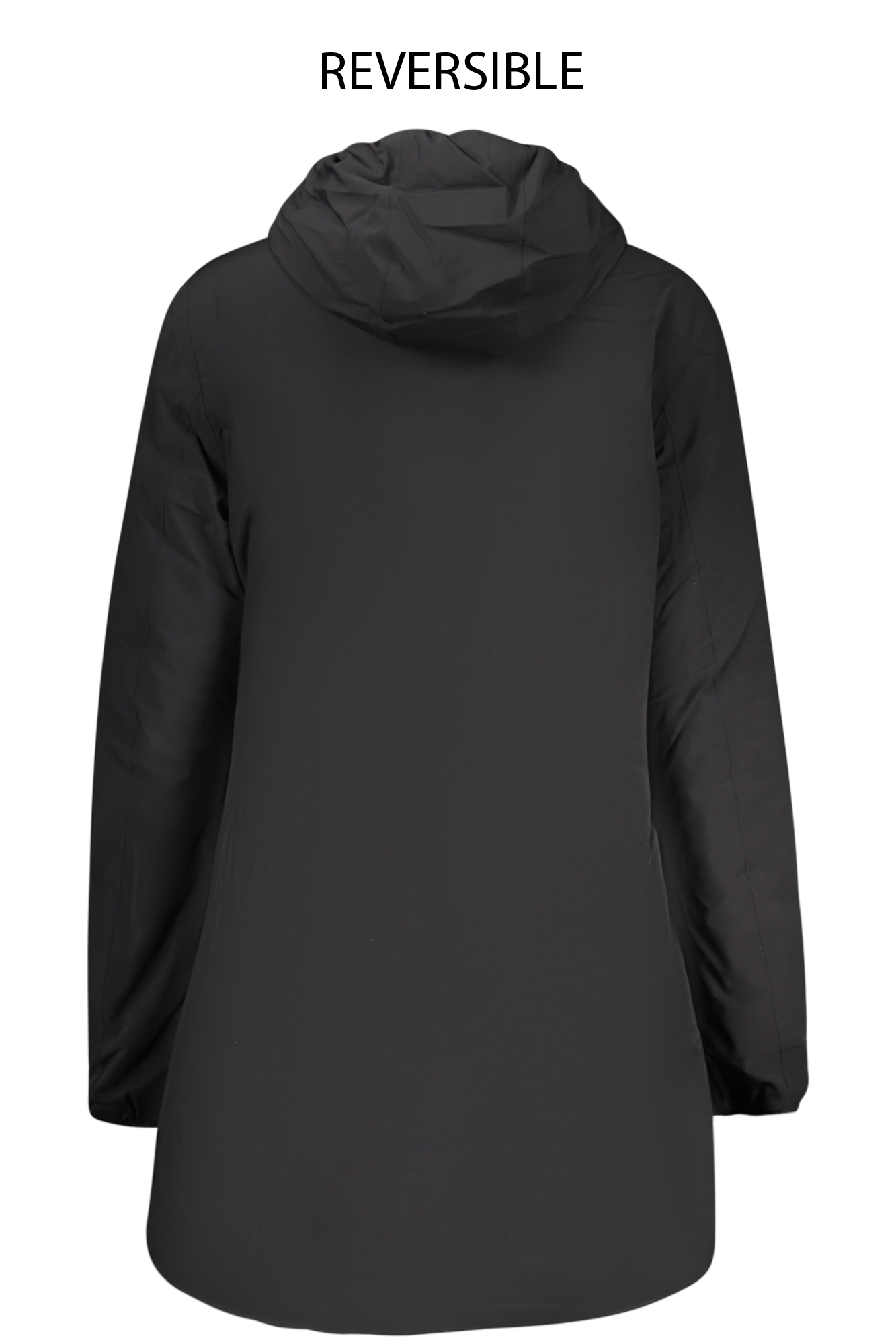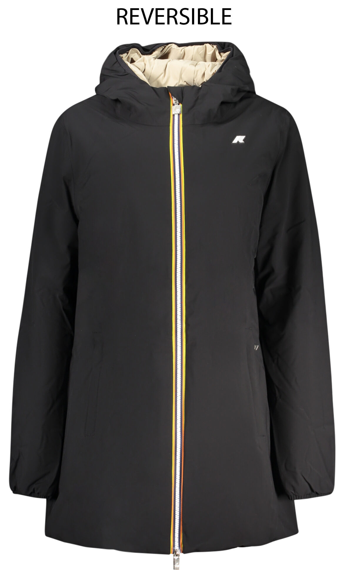Casaco de manga comprida e capuz fixo, com design reversível nas cores Preto e bege, oferecendo duas opções de estilo em uma só peça.