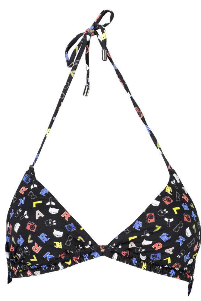 Maiô triangular, gravata, fecho de pressão e gravata, detalhes contrastantes, estampa, logotipo