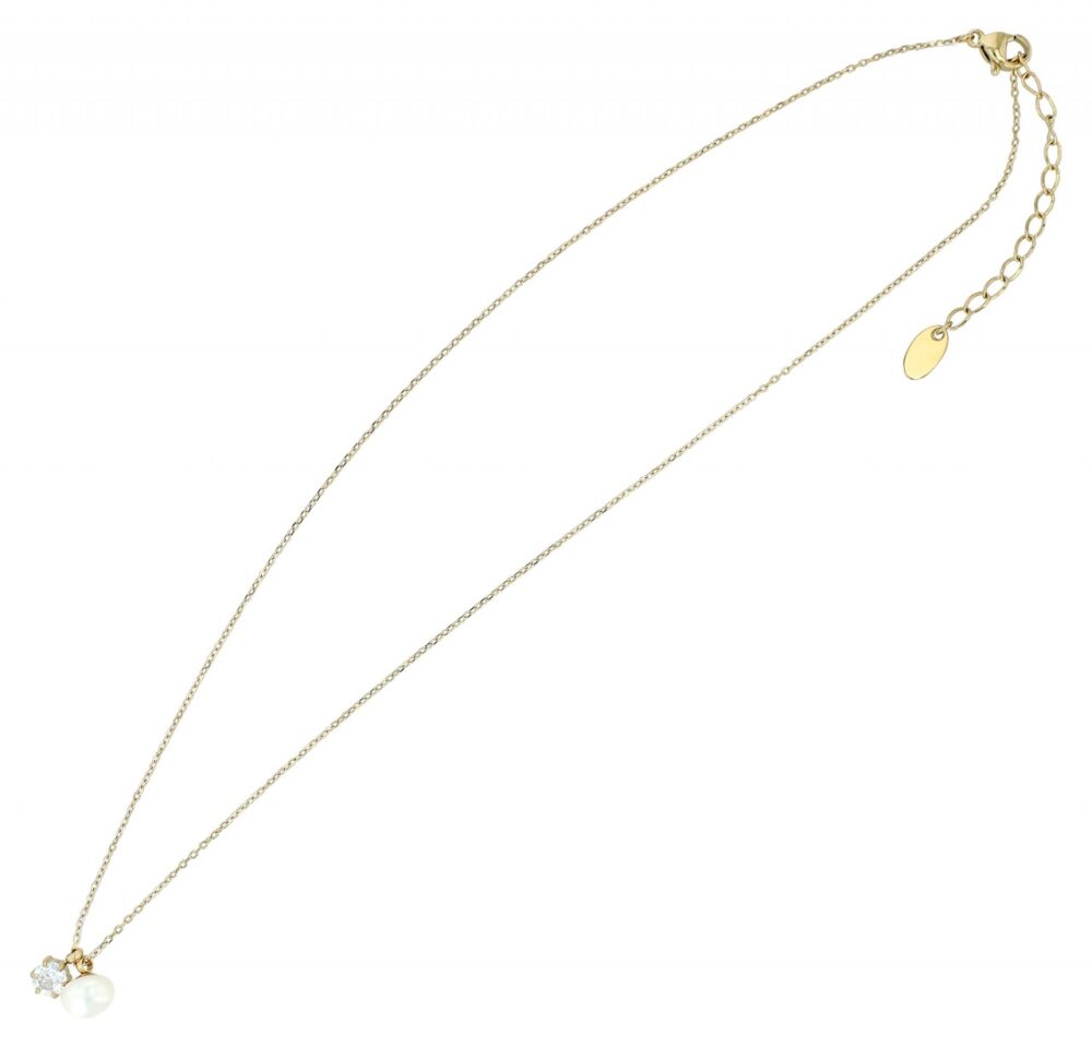 Esta corrente de aço inoxidável dourada combina elegância clássica com algo especial. Uma pérola de água doce brilhante (6 x 8 mm) e uma zircônia radiante em um engaste de garra (Ø 5 mm) pendem harmoniosamente uma ao lado da outra e dão à joia um brilho nobre. A elegante corrente de joias pode ser aberta e fechada com um gancho de encaixe, o que garante uma fixação segura e evita que ela se abra sozinha. Com 41 cm de comprimento e 5 cm de extensão, oferece opções flexíveis de transporte e cria toques de estilo.