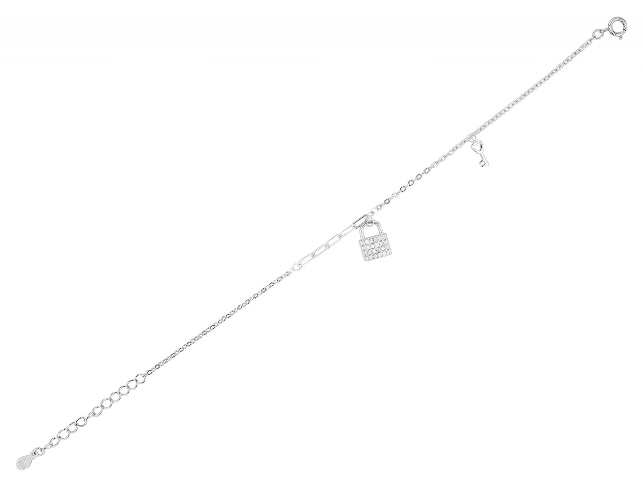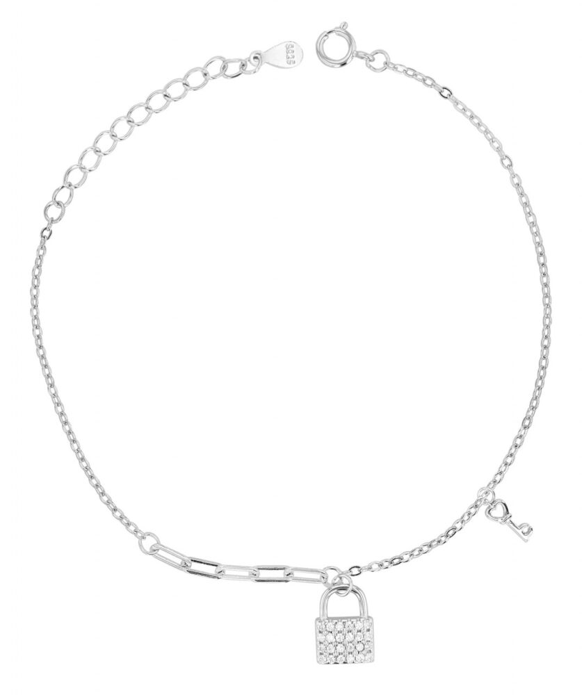 Esta encantadora pulseira em prata de lei 925 de alta qualidade é o acessório perfeito para qualquer ocasião, quer seja como um companheiro do dia a dia ou como um detalhe expressivo para ocasiões especiais. Com um comprimento total de 17 cm e uma prática extensão, a peça de joalharia pode ser ajustada individualmente. A parte intermédia chama a atenção: uma corrente de âncora vistosa com 2,5 cm que, combinada com os dois delicados pendentes – um cadeado com zircónias e uma chave – fazem desta uma peça de joalharia elegante e intemporal. Símbolo de ligação e confiança, é um presente ideal para uma pessoa muito especial.