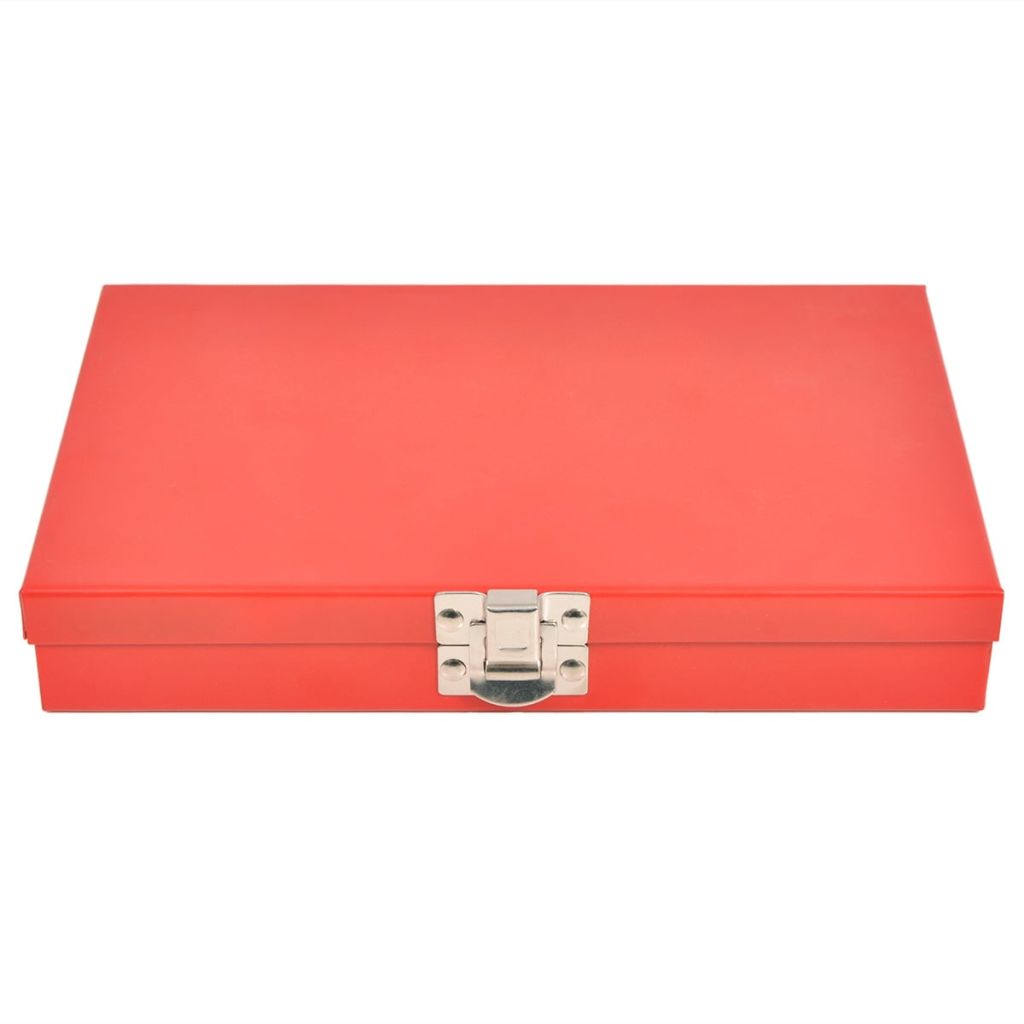 O kit robusto e durável é feito de aço de carbono e liga de aço fortes. As inserções têm uma guia completamente firme e estanque. Todas as ferramentas e inserções são entregues numa caixa de metal resistente para fácil armazenamento e transporte.