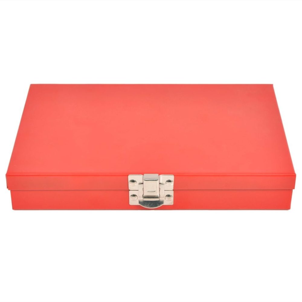 O kit robusto e durável é feito de aço de carbono e liga de aço fortes. As inserções têm uma guia completamente firme e estanque. Todas as ferramentas e inserções são entregues numa caixa de metal resistente para fácil armazenamento e transporte.