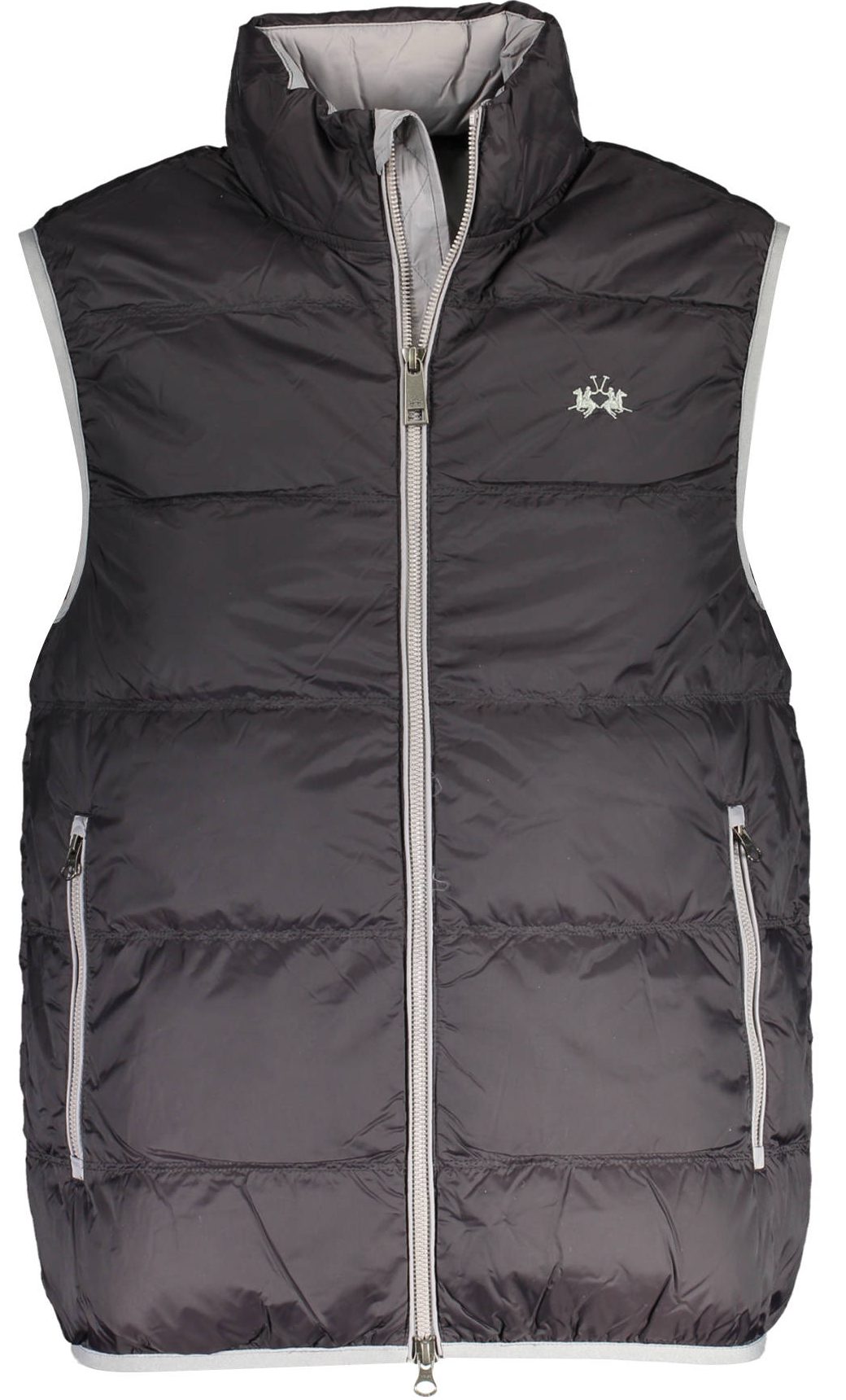 Sem mangas, 2 bolsos externos, 2 bolsos internos, detalhes contrastantes, bordado, zíper, logotipo.