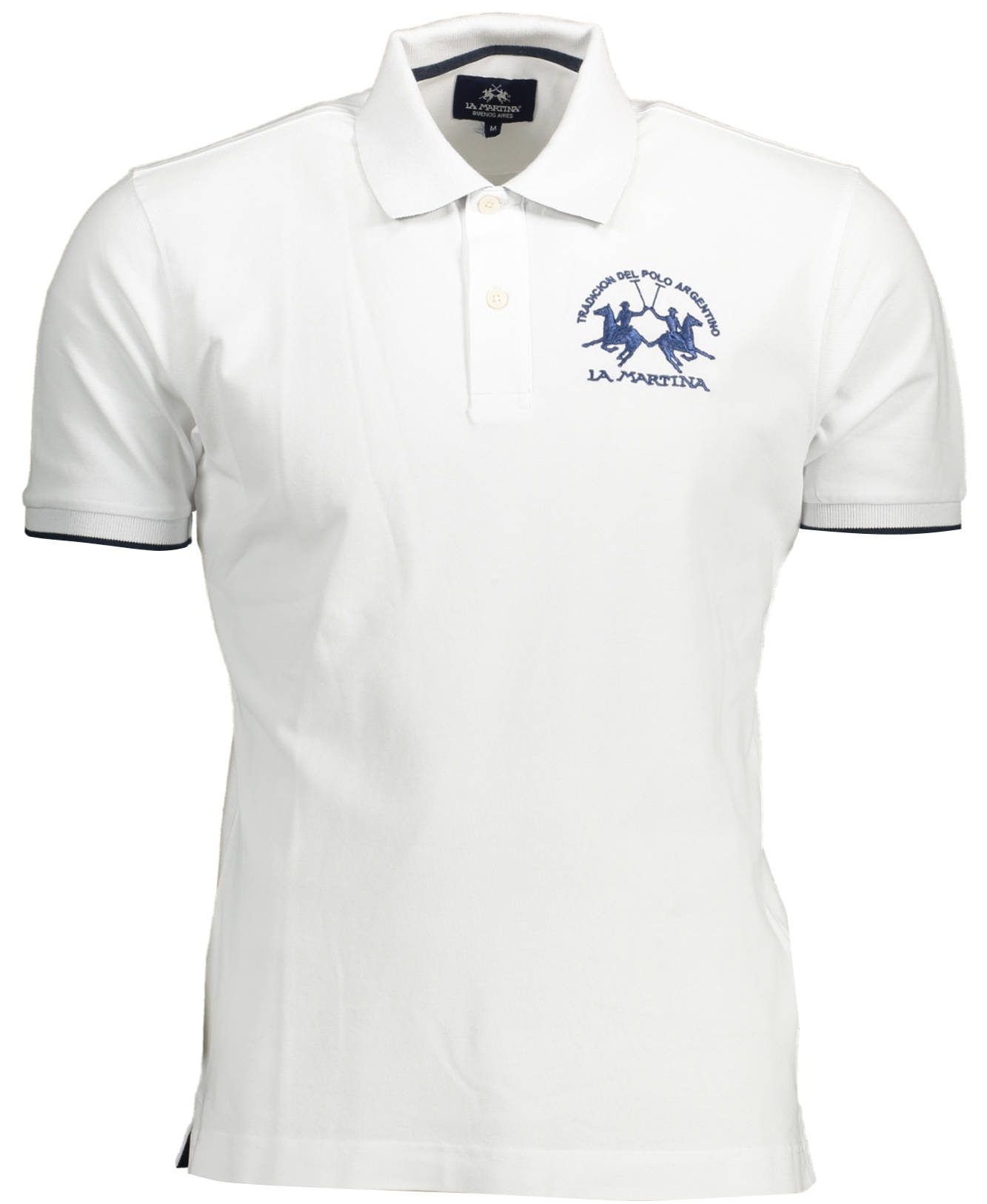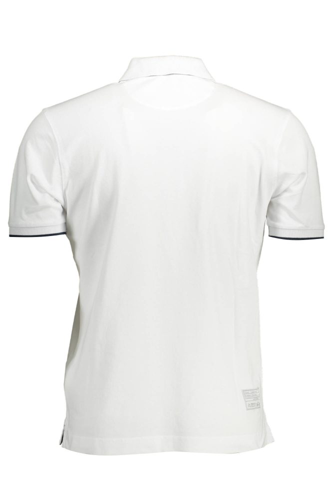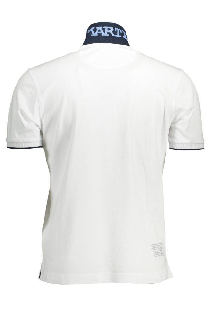Polo branco de manga curta com 2 botões, detalhes de contraste e logótipo bordado.