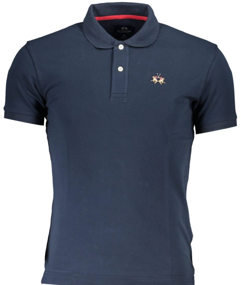 Polo azul escuro de manga curta com 2 botões, detalhes de contraste e logótipo bordado.