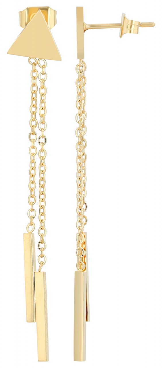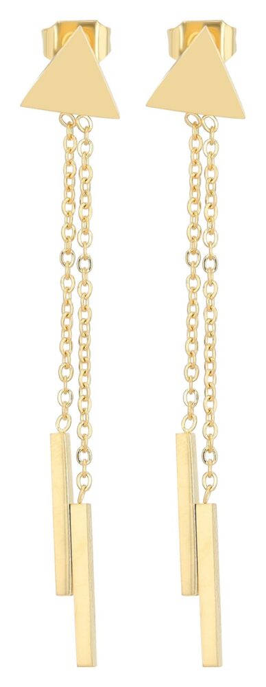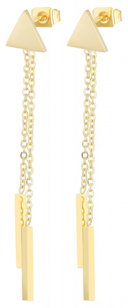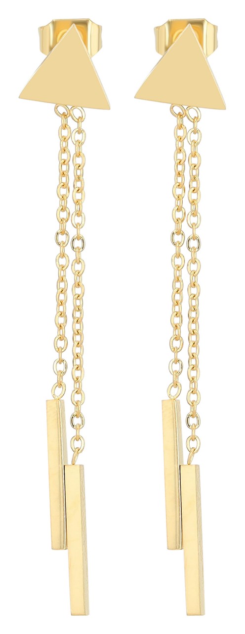 Os brincos consistem em um triângulo com duas correntes presas de comprimentos diferentes. As barras retangulares presas à ponta da corrente balançam a cada movimento e fazem da joia um verdadeiro chamariz. Os brincos são presos ao furo da orelha com um parafuso borboleta, que também é feito de aço inoxidável. O tamanho total dos brincos é de 56 mm de comprimento, 8 mm de largura e 1 mm de espessura.