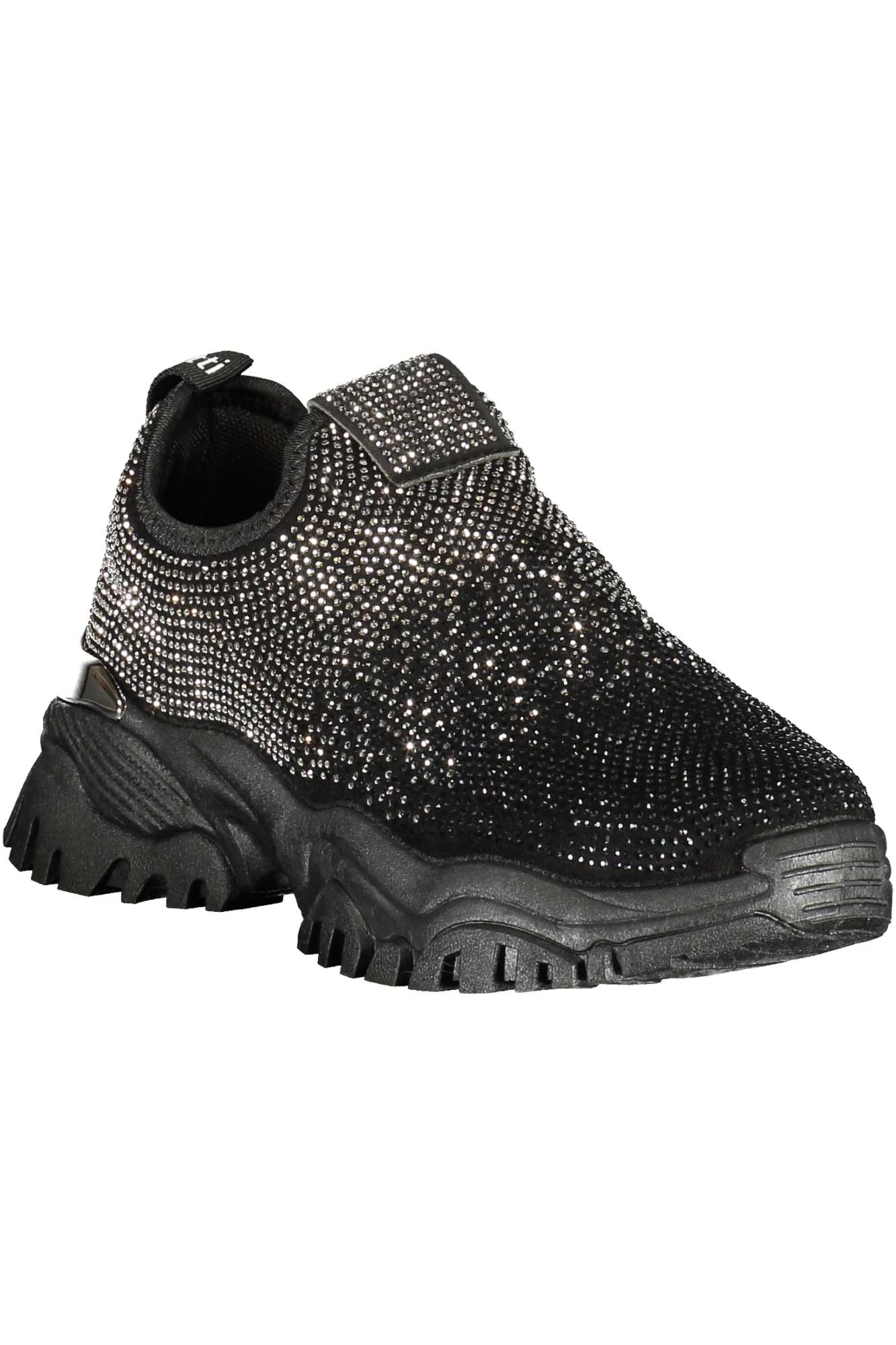 Os detalhes dourados em contraste e a aplicação de strass conferem um toque elegante e moderno ao design, enquanto o logótipo da marca reforça a identidade da peça.
