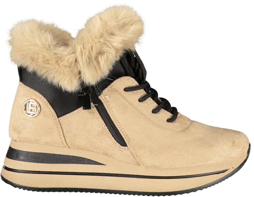 Bota de tornozelo com cadarços, zíper lateral, detalhes contrastantes, aplicação, logo
