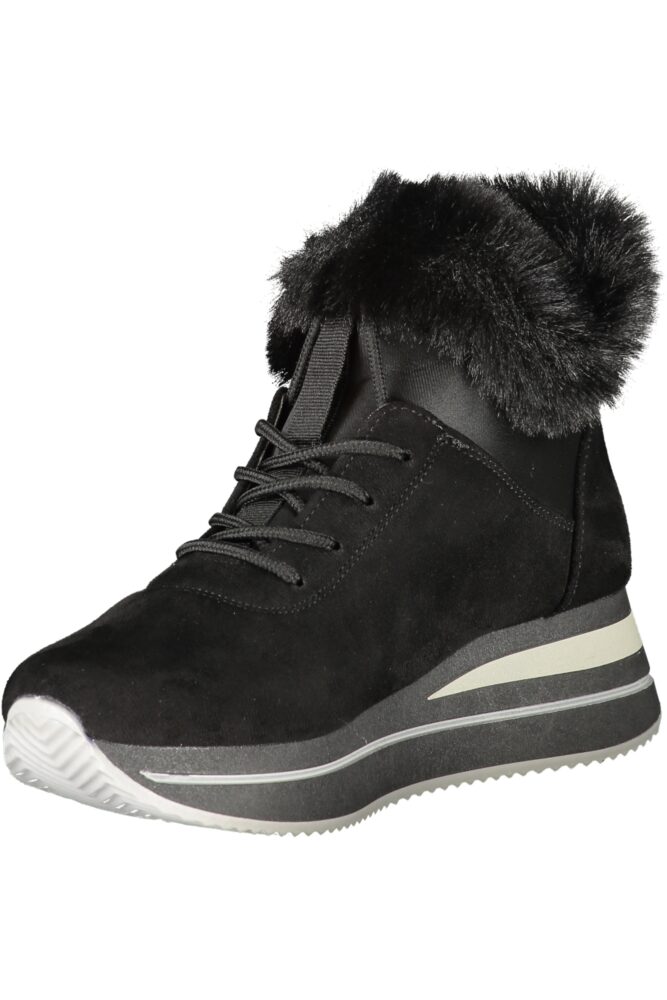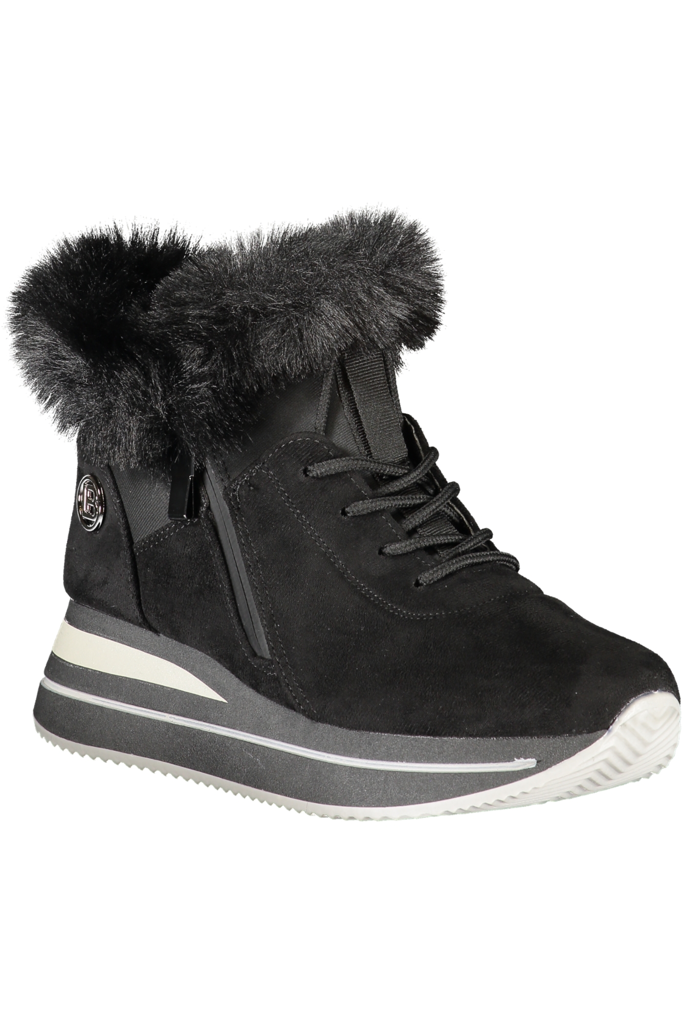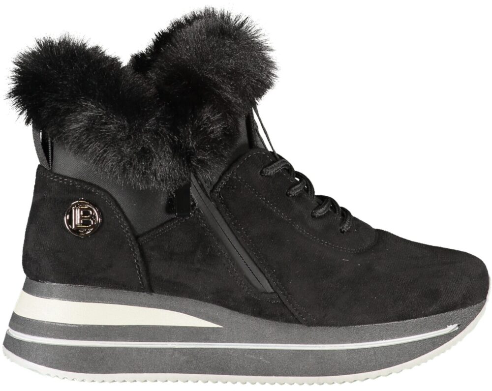 Bota de tornozelo com cadarços, zíper lateral, detalhes contrastantes, aplicação, logo