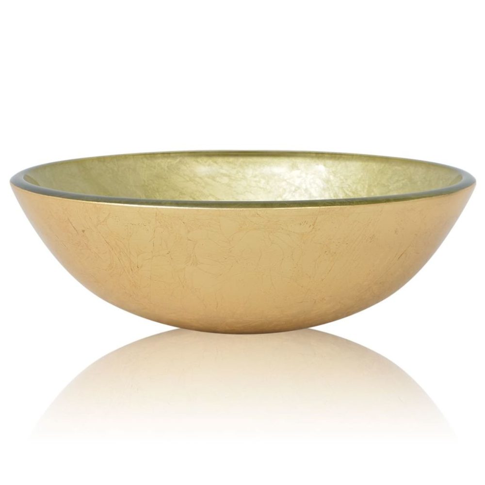 Este lavatório, feito de vidro temperado de alta qualidade com um acabamento dourado, será uma adição elegante a qualquer casa de banho, zona de lavagem ou toalete. Foi concebido para ser instalado em cima de um móvel.