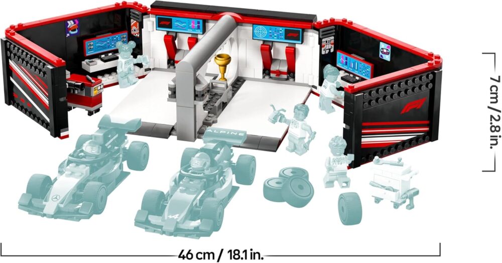 - Personagens para encenação: 2 minifiguras de piloto e 4 de mecânico, e um troféu
