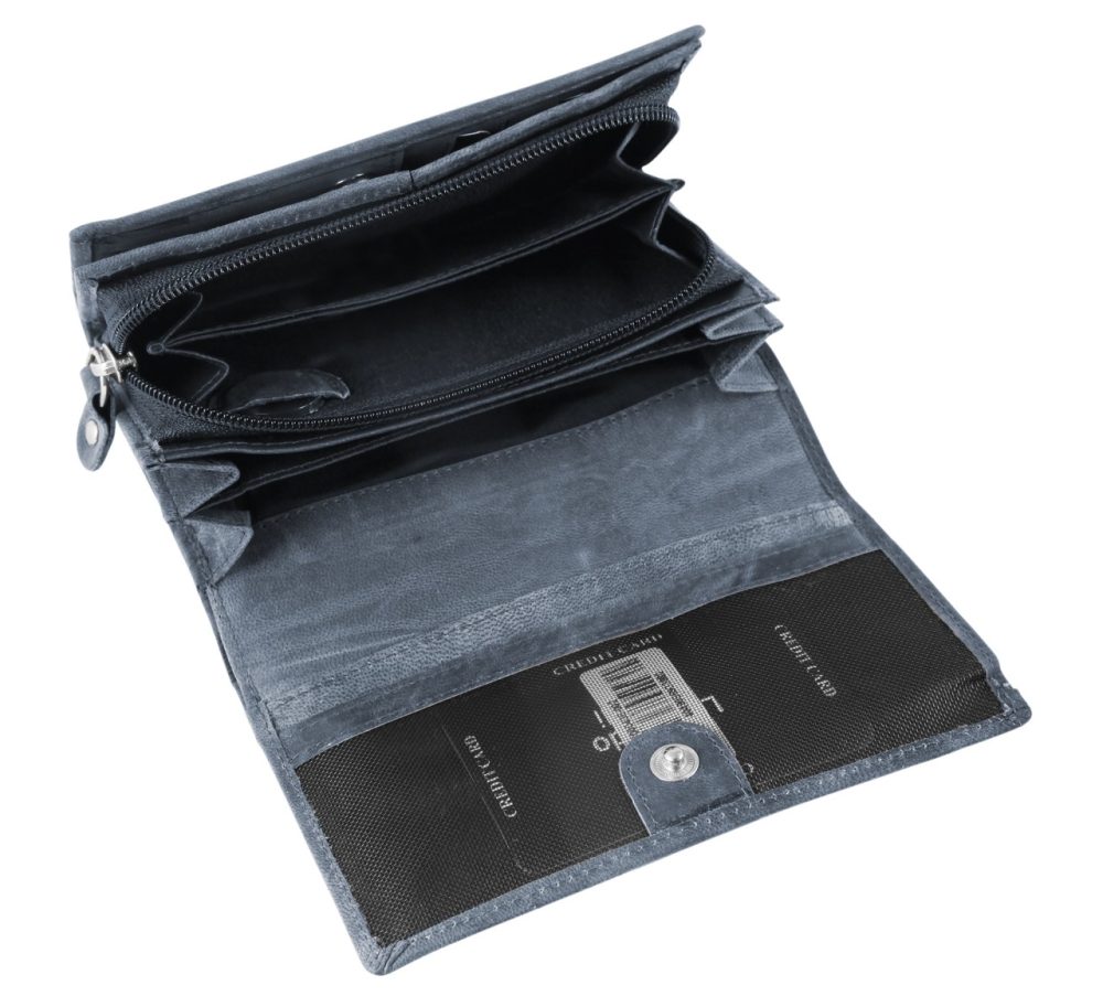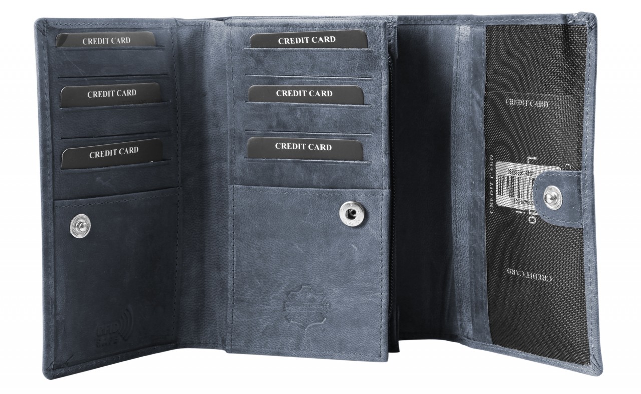 A carteira de Leonardo Verrelli é confeccionada em formato paisagem em pele de cabra genuína e tem um visual levemente áspero. A costura externa e interna da carteira garante boa durabilidade e estabilidade. A carteira é um verdadeiro milagre de espaço e oferece muito espaço de armazenamento para todos os documentos importantes. A carteira está dividida em 12 compartimentos para cartões de crédito, 3 compartimentos para notas, 2 compartimentos para moedas com fichas de compras, 1 compartimento exterior com fecho e 3 bolsos. A carteira fecha com um prático fecho de pressão. O tamanho, sem preenchimento, tem 10,0 cm de comprimento, 15,5 cm de largura e 4,0 cm de espessura. Graças à proteção RFID integrada, todos os cartões com chip estão protegidos contra ataques fraudulentos.