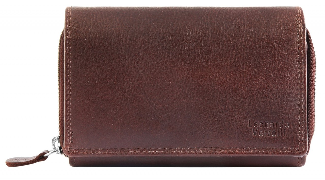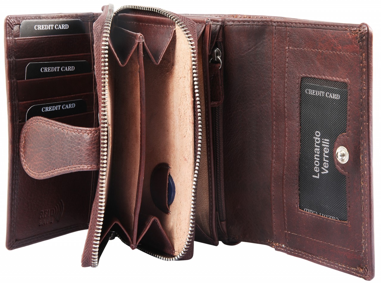 A carteira Leonardo Verrelli é um verdadeiro milagre de espaço e oferece muito espaço de armazenamento para todos os documentos importantes. A carteira está dividida em 13 compartimentos para cartões de crédito, 3 compartimentos para notas, 1 compartimento para moedas com fichas de compras, 1 compartimento exterior com fecho e 5 bolsos. A carteira fecha com um prático fecho de pressão. O tamanho, sem preenchimento, tem 15,0 cm de comprimento, 4,0 cm de largura e 10,0 cm de espessura. Graças à proteção RFID integrada, todos os cartões com chip estão protegidos contra ataques fraudulentos.