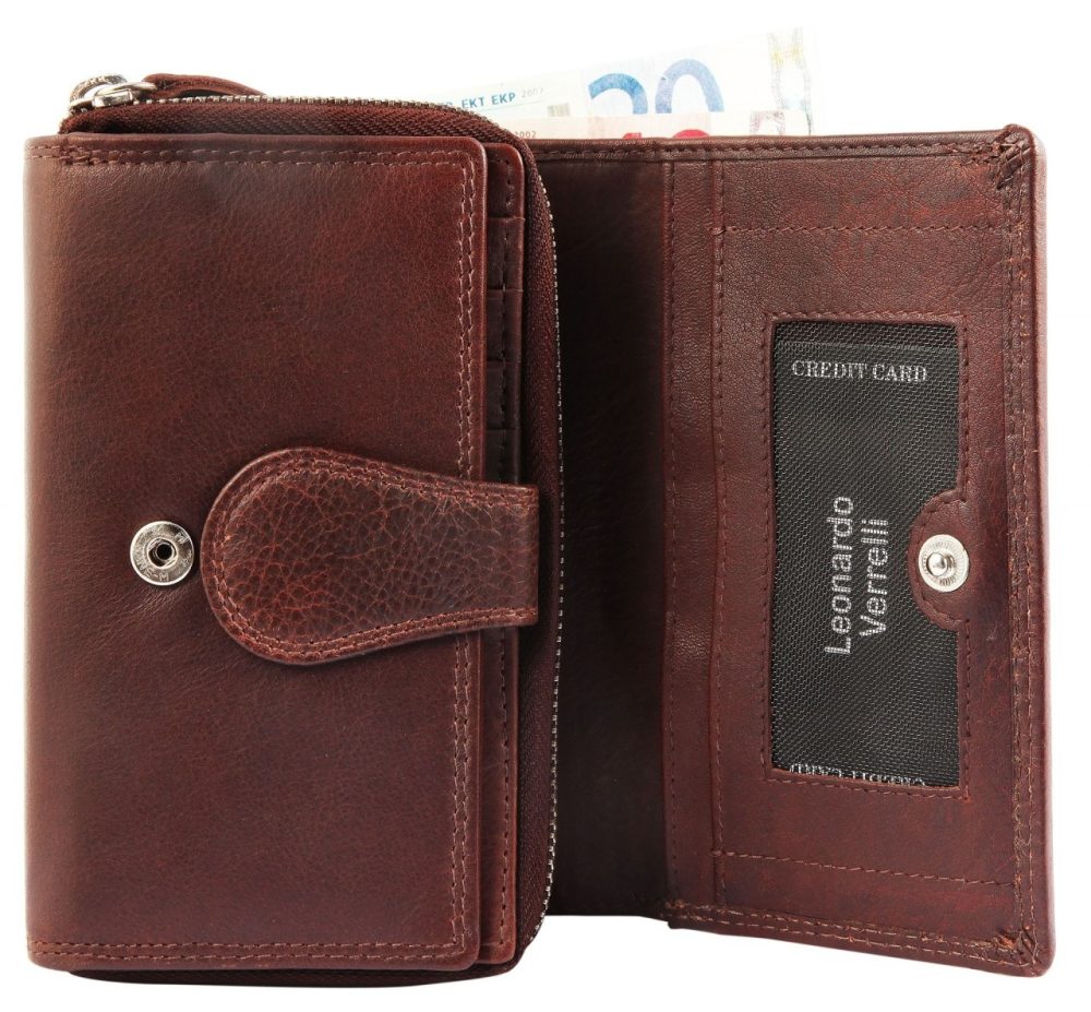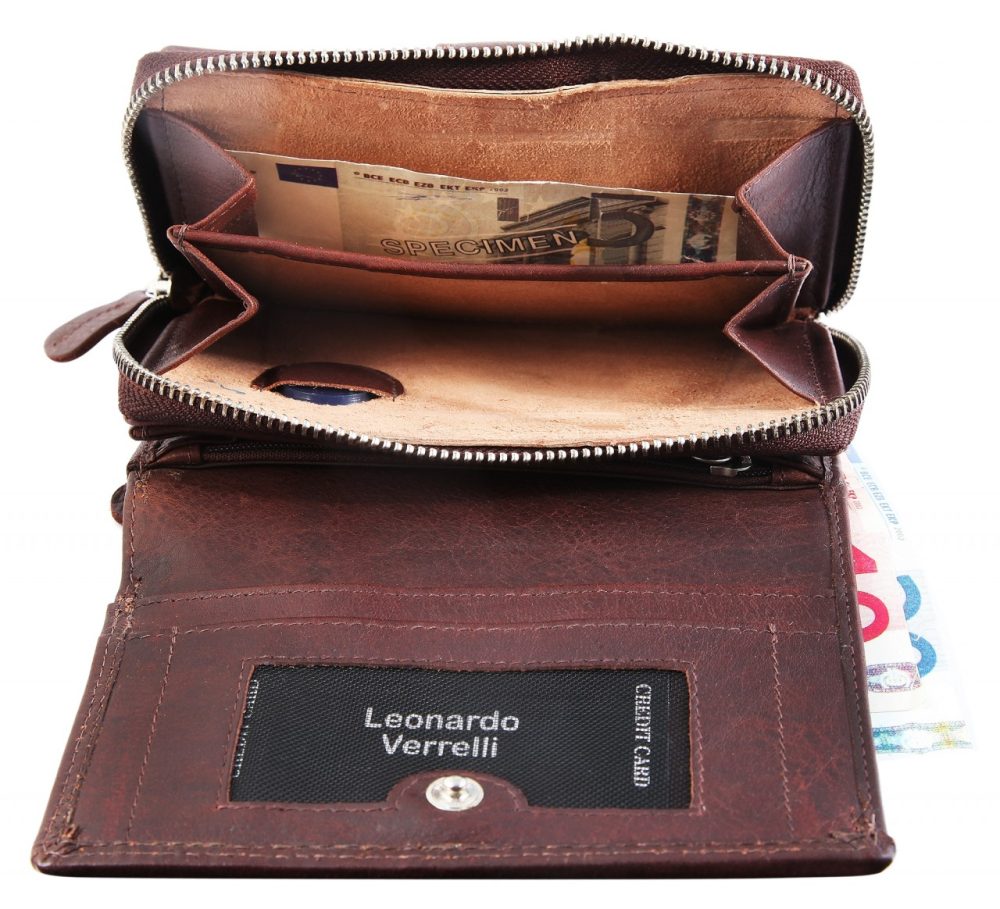 A carteira Leonardo Verrelli é um verdadeiro milagre de espaço e oferece muito espaço de armazenamento para todos os documentos importantes. A carteira está dividida em 13 compartimentos para cartões de crédito, 3 compartimentos para notas, 1 compartimento para moedas com fichas de compras, 1 compartimento exterior com fecho e 5 bolsos. A carteira fecha com um prático fecho de pressão. O tamanho, sem preenchimento, tem 15,0 cm de comprimento, 4,0 cm de largura e 10,0 cm de espessura. Graças à proteção RFID integrada, todos os cartões com chip estão protegidos contra ataques fraudulentos.