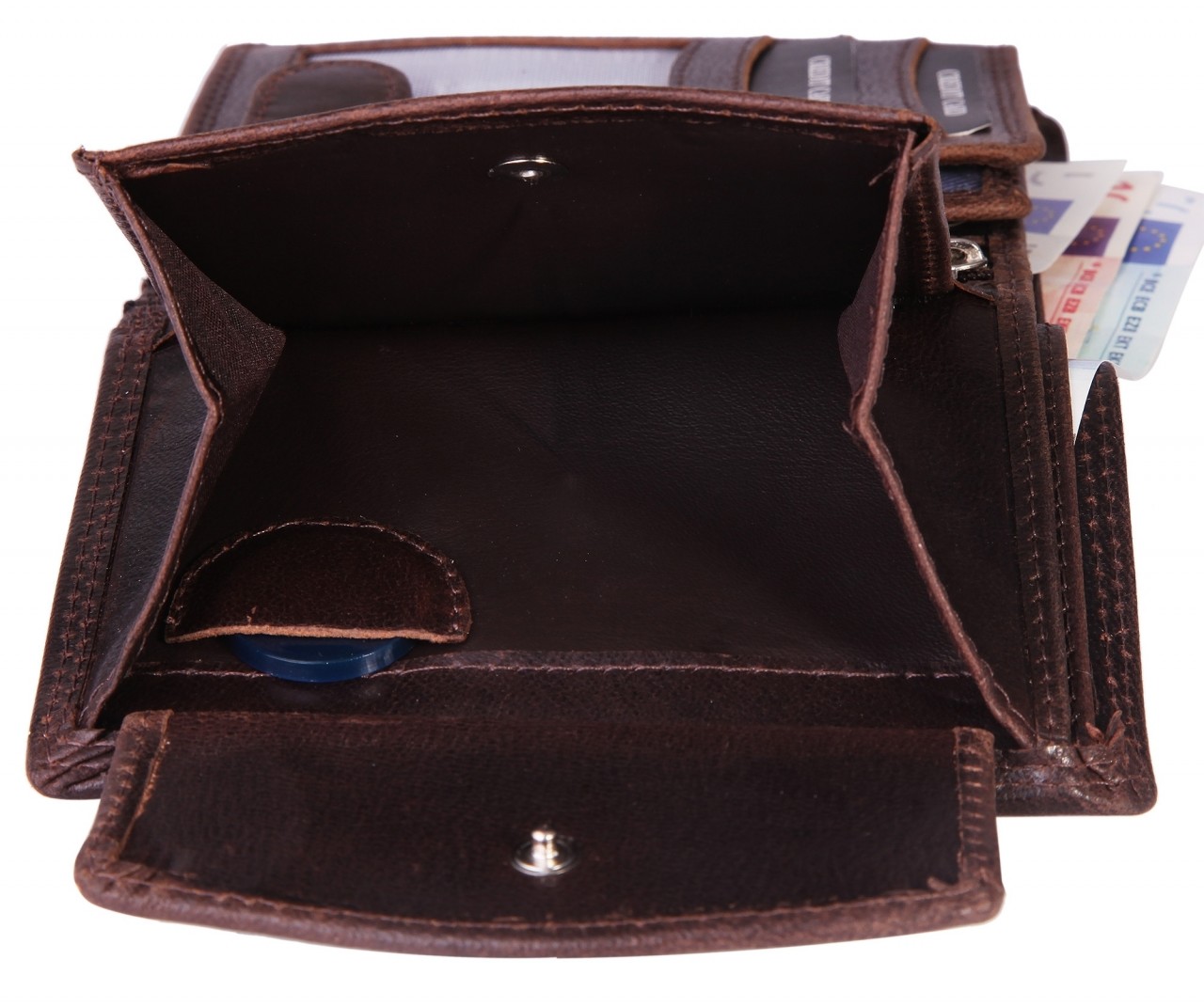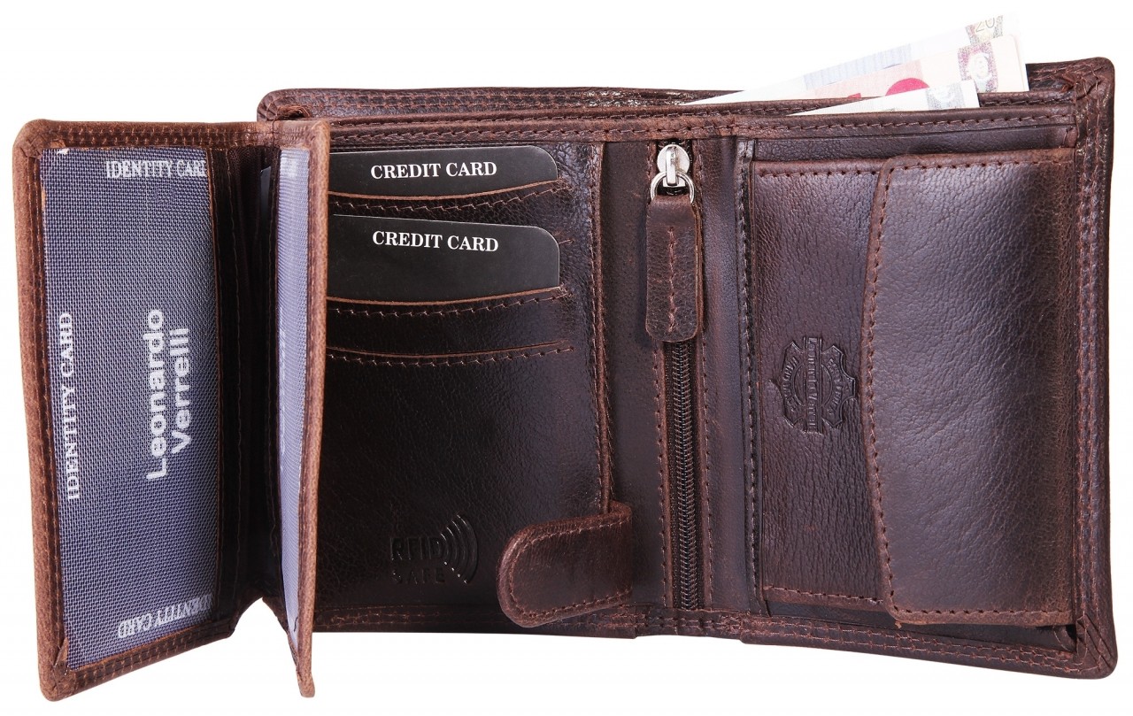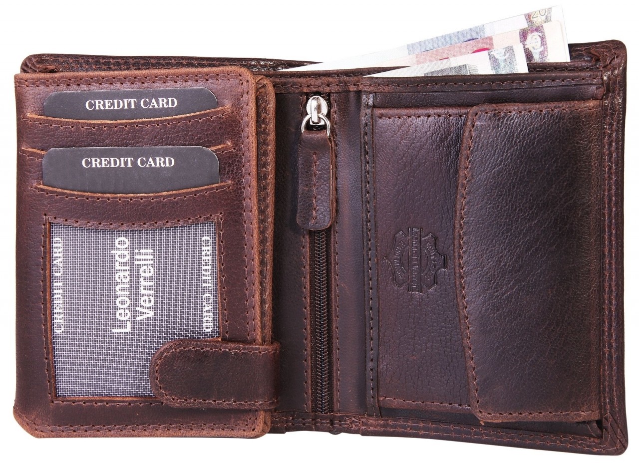 A carteira masculina em formato Horch da marca Leonardo Verrelli é confeccionada em couro genuíno. O forro interno é confeccionado em material sintético. A costura dupla na parte externa e interna da carteira garante boa durabilidade e estabilidade. A carteira oferece muito espaço de armazenamento para todos os documentos importantes. A carteira está dividida em 11 compartimentos para cartões de crédito, 2 compartimentos para notas, 1 compartimento para moedas, 1 compartimento com fecho de correr na zona interior com 2 bolsos, 2 bolsos adicionais e 2 bolsos transparentes para identificação, que podem ser fechados com um prático fecho de pressão.