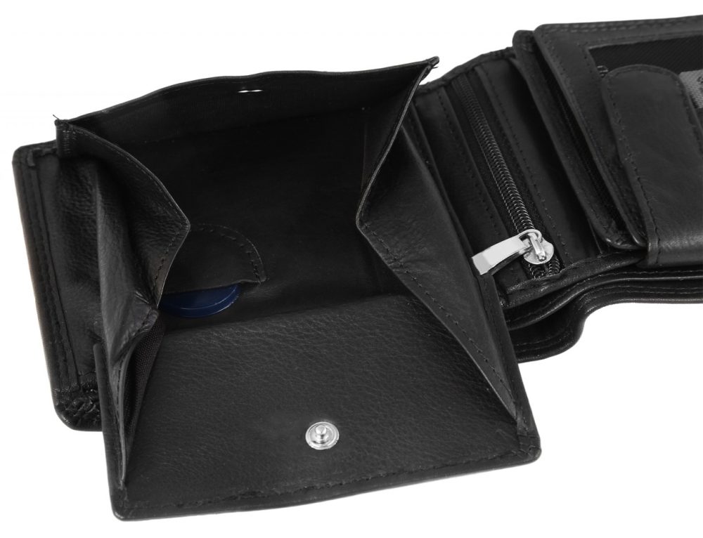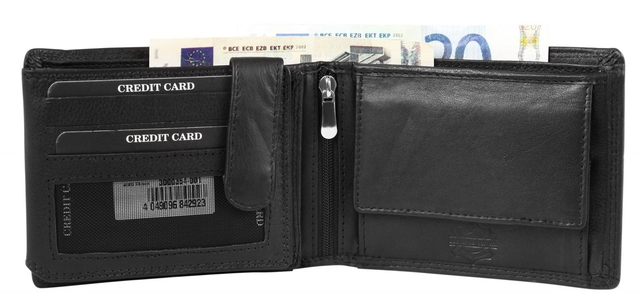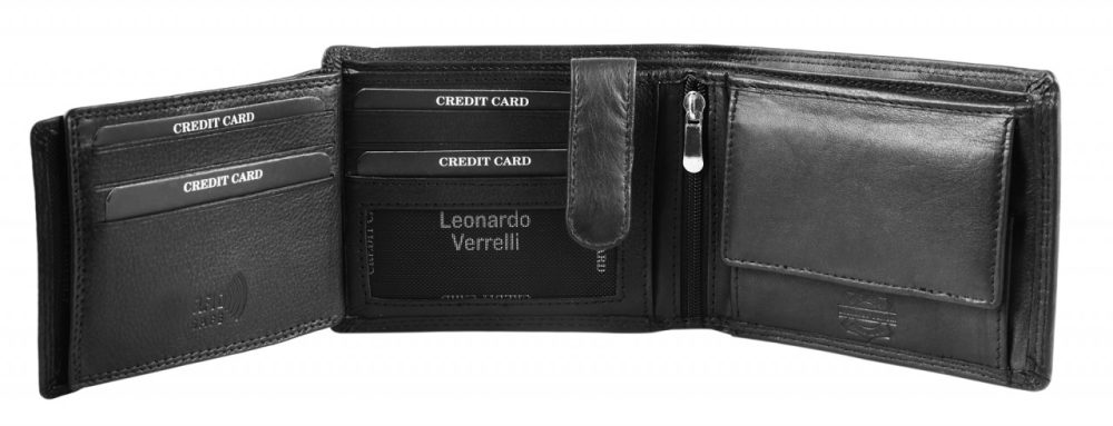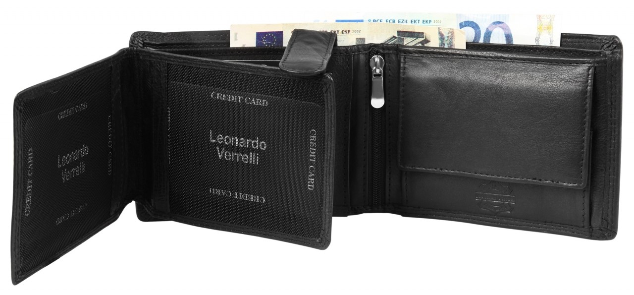 A carteira masculina em formato paisagem da marca Leonardo Verrelli é confeccionada em couro. O forro interno é maioritariamente feito de couro, o restante é feito de tecido. A costura dupla na parte externa e interna da carteira garante boa durabilidade e estabilidade. A carteira oferece muito espaço de armazenamento para todos os documentos importantes. A carteira está dividida em 9 compartimentos para cartões, 2 compartimentos para notas, 1 compartimento para moedas, 1 compartimento com fecho na zona interior, 2 bolsos deslizantes e 2 compartimentos transparentes para identificação, que podem ser protegidos com um prático fecho de pressão.