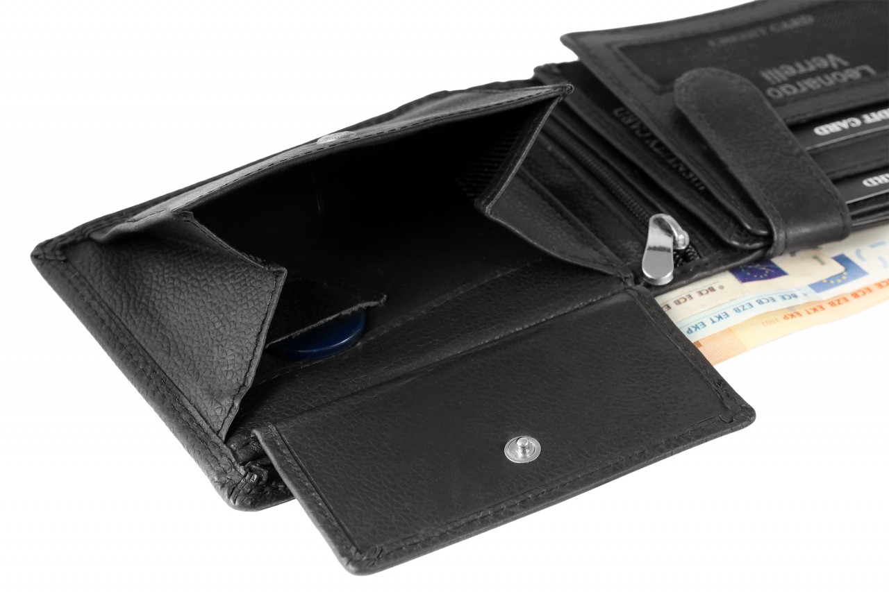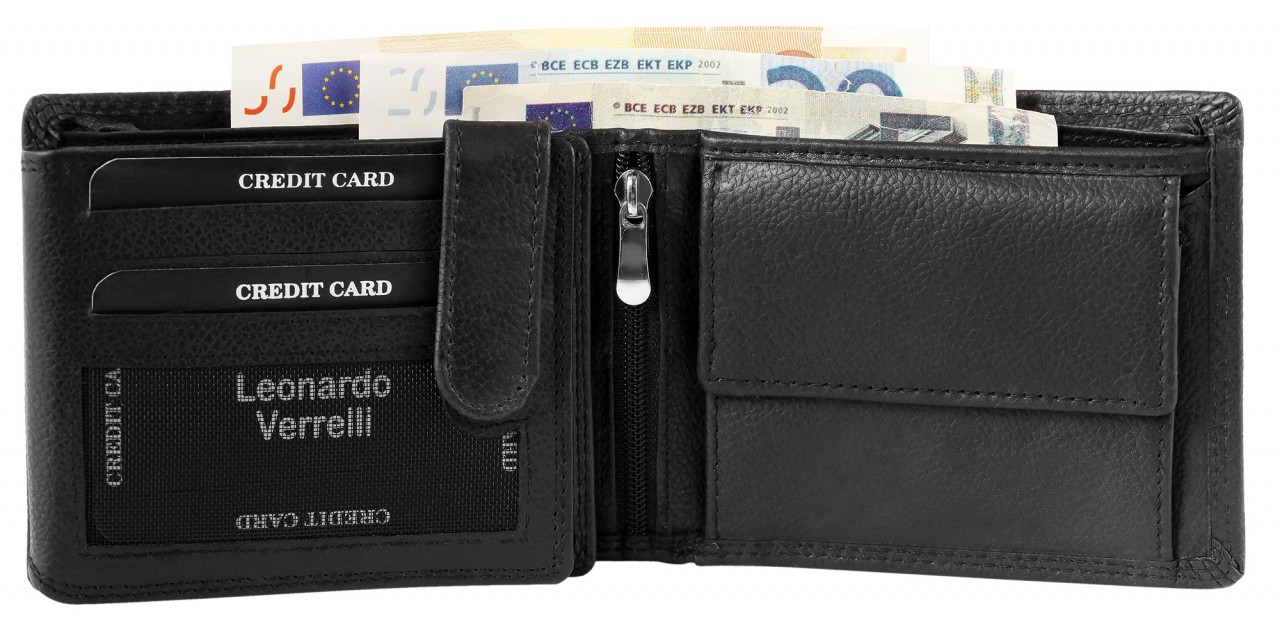 A carteira masculina em formato paisagem da marca Leonardo Verrelli é confeccionada em couro. O forro interno é feito de tecido. A costura dupla na parte externa e interna da carteira garante boa durabilidade e estabilidade. A carteira oferece muito espaço de armazenamento para todos os documentos importantes. A carteira está dividida em 11 compartimentos para cartões de crédito, 2 compartimentos para notas, 1 compartimento para moedas, 1 compartimento com fecho na zona interior, 2 bolsos deslizantes e 2 compartimentos transparentes para identificação, que podem ser protegidos com um prático fecho de pressão.