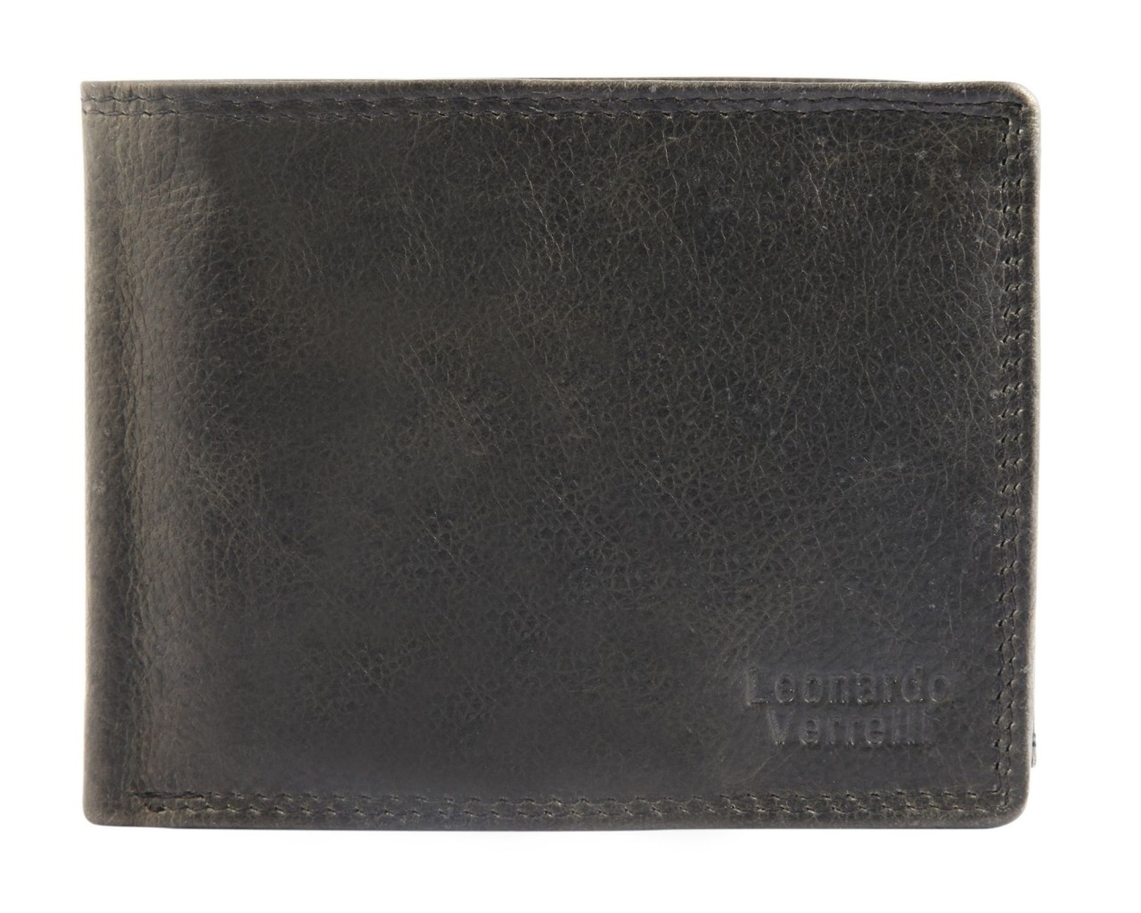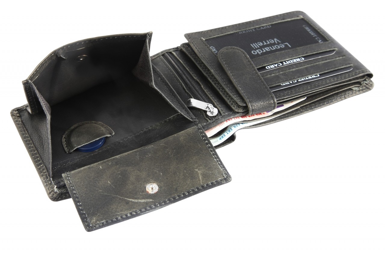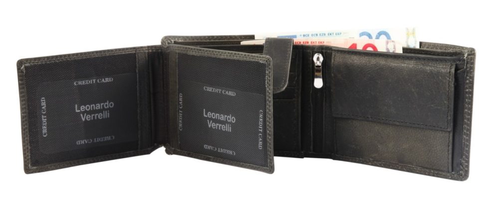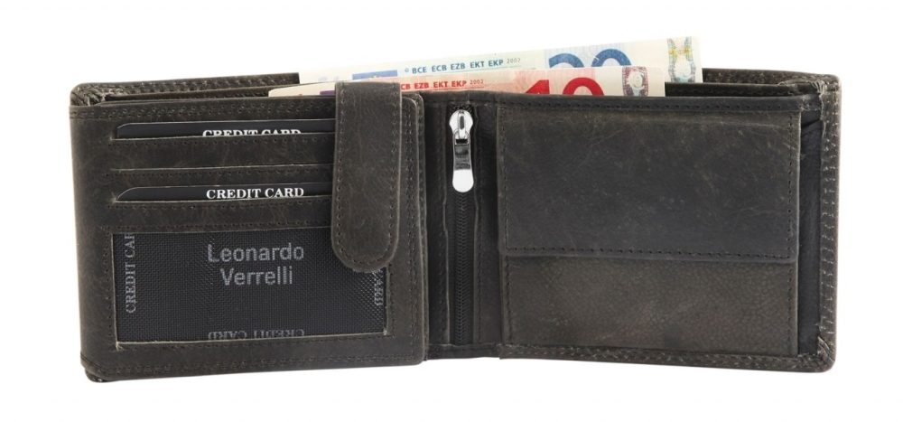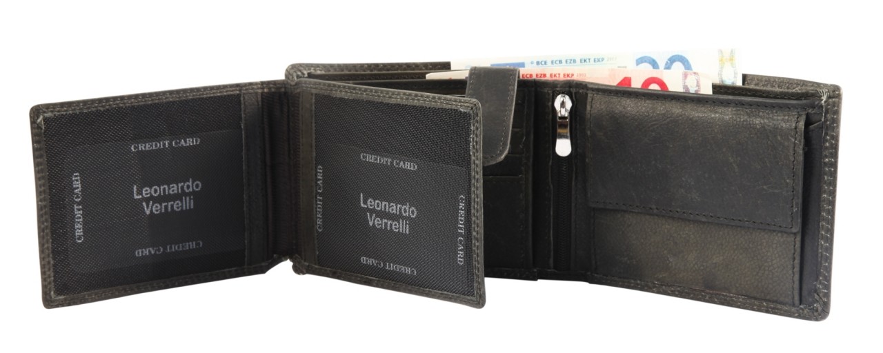 A carteira masculina em formato paisagem da marca Leonardo Verrelli é confeccionada em couro bovino. O forro interno é feito de tecido. A costura dupla na parte externa e interna da carteira garante boa durabilidade e estabilidade. A carteira oferece muito espaço de armazenamento para todos os documentos importantes. A carteira está dividida em 11 compartimentos para cartões de crédito, 2 compartimentos para notas, 1 compartimento para moedas com chip de compras, 1 compartimento com fecho na zona interior, 2 bolsos deslizantes e 2 compartimentos transparentes para identificação, que podem ser protegidos com um prático fecho de pressão.