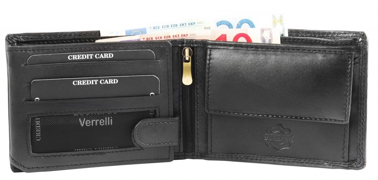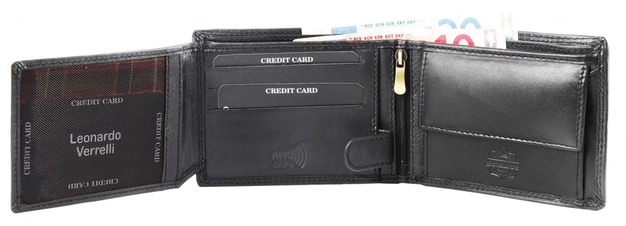 A carteira da marca Leonardo Verrelli foi confeccionada em formato paisagem em couro bovino genuíno e tem visual vintage moderno. A costura dupla na parte externa e interna da carteira garante boa durabilidade e estabilidade. A carteira está dividida em 6 compartimentos para cartões de crédito, 2 compartimentos para notas, 1 compartimento para moedas com chip de compras, 1 compartimento com fecho na zona interior, 2 bolsos deslizantes e 1 compartimento transparente para identificação, que pode ser fechado com um prático fecho de pressão.